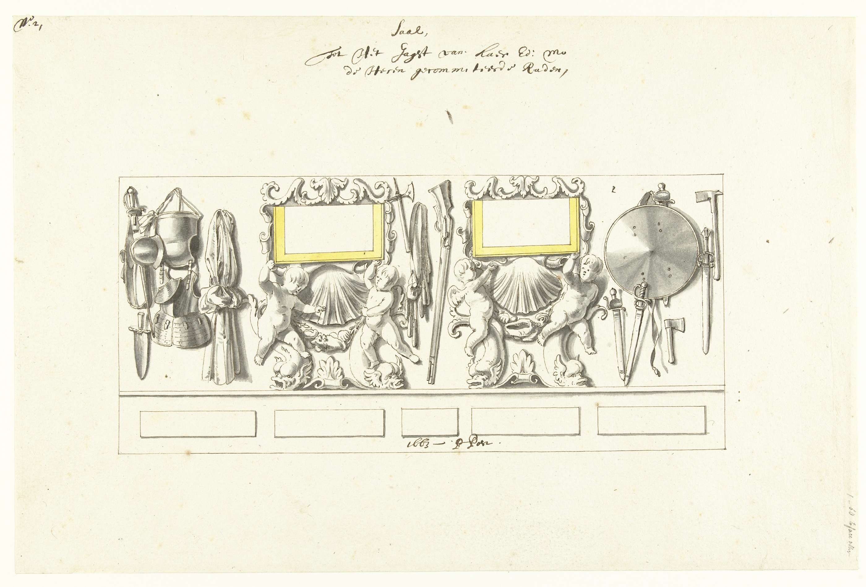 Ontwerpen voor decoraties van het interieur van het statenjacht van de Gecommitteerde Raden van Holland: zaal, zijwand met trofeeën.