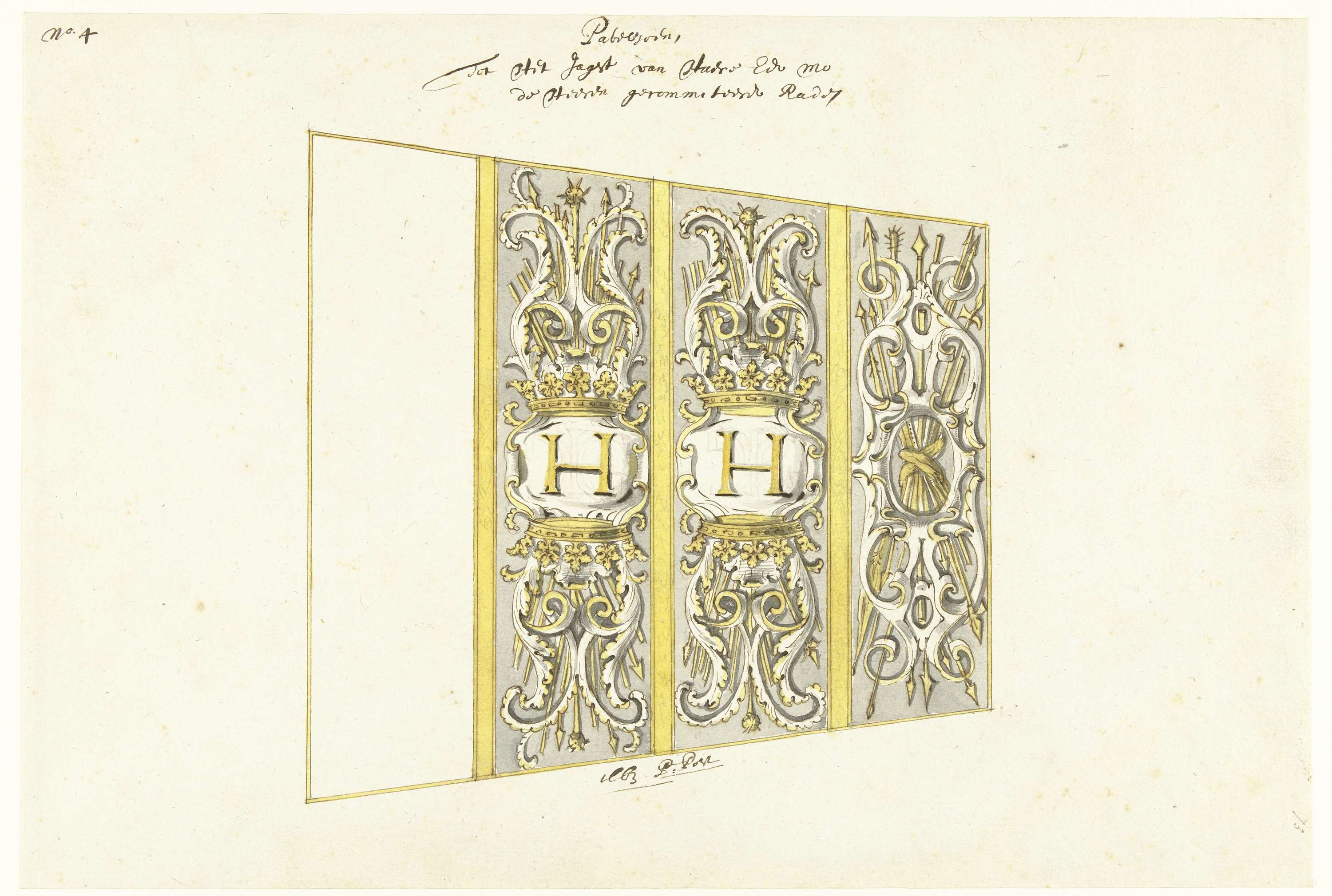 Ontwerpen voor decoraties van het interieur van het statenjacht van de Gecommitteerde Raden van Holland: paviljoen, zoldering, met wapentrofeëen, twee ervan met de letter H in het midden.