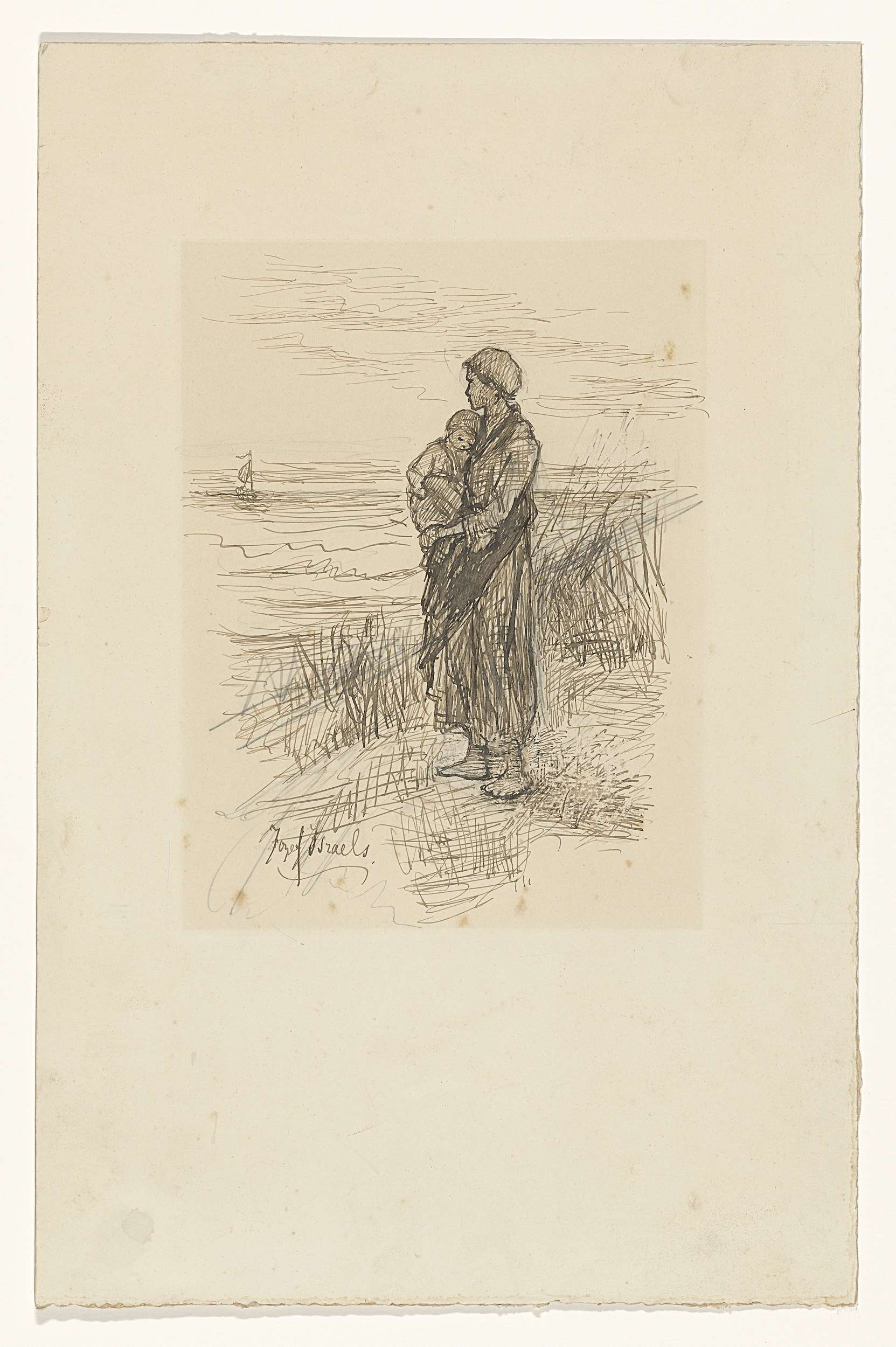 Vissersvrouw met kind op de arm aan het strand