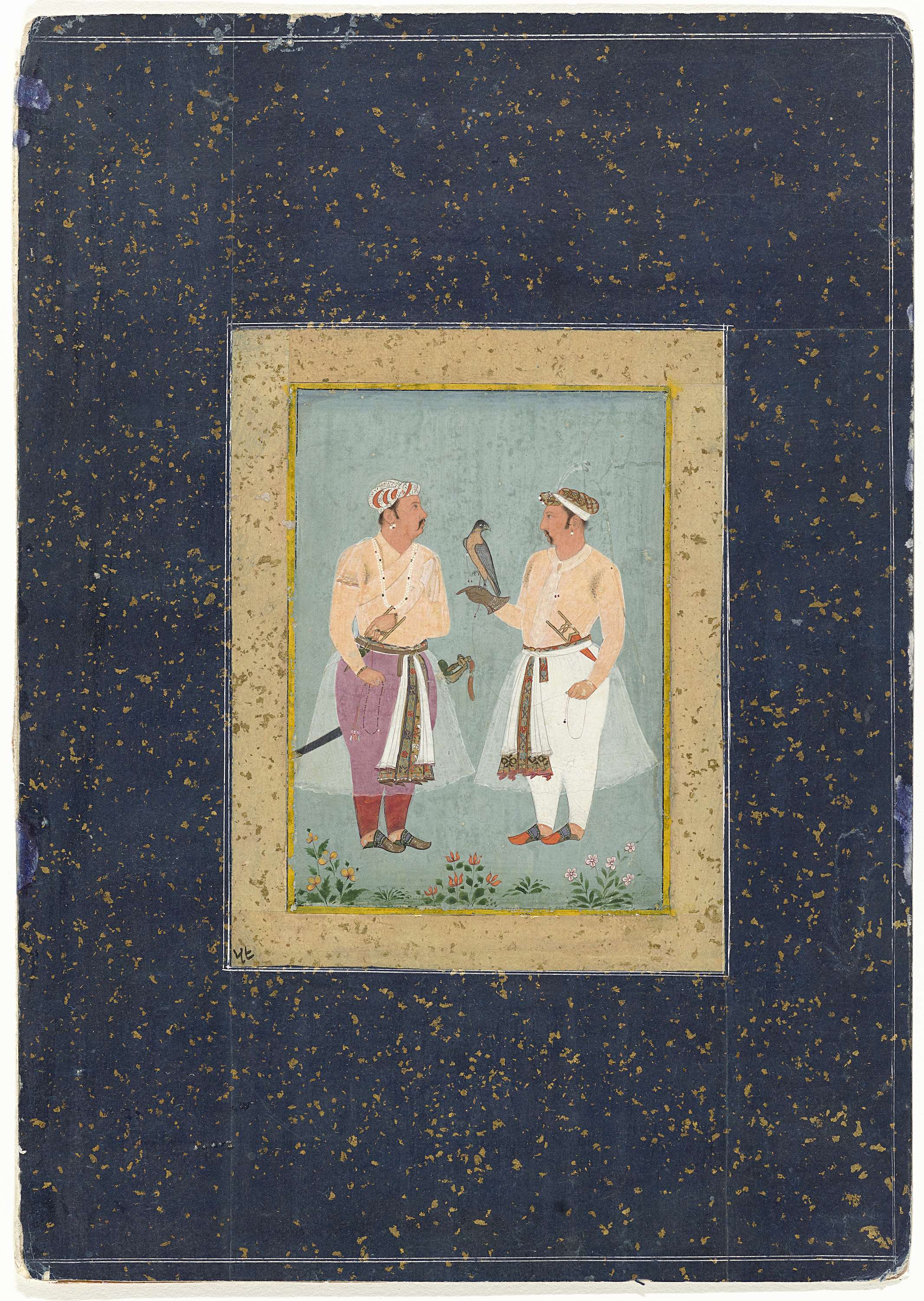 Twee staande hovelingen, de rechter met een roofvogel op de arm