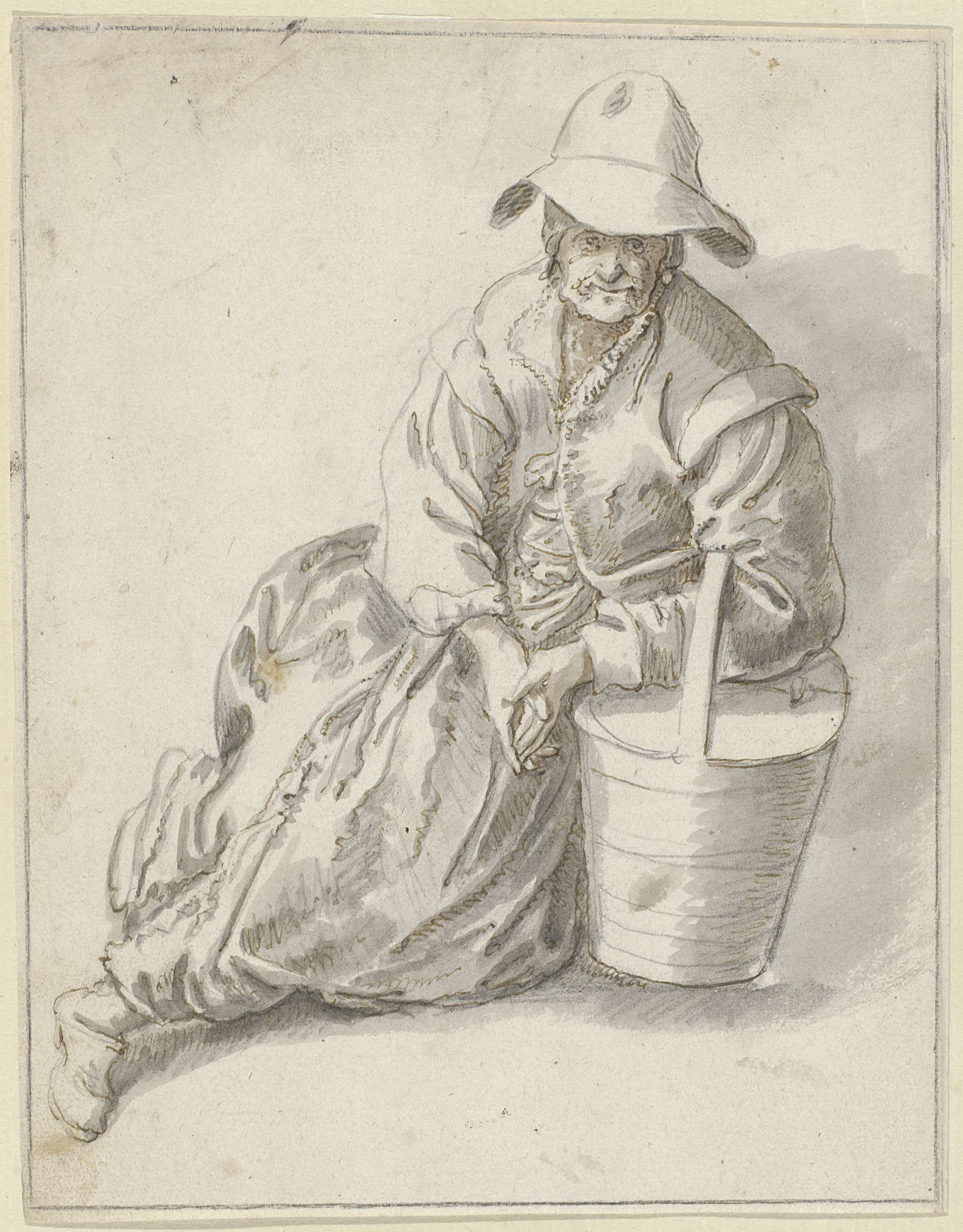 Zittende vrouw, leunend op een mand