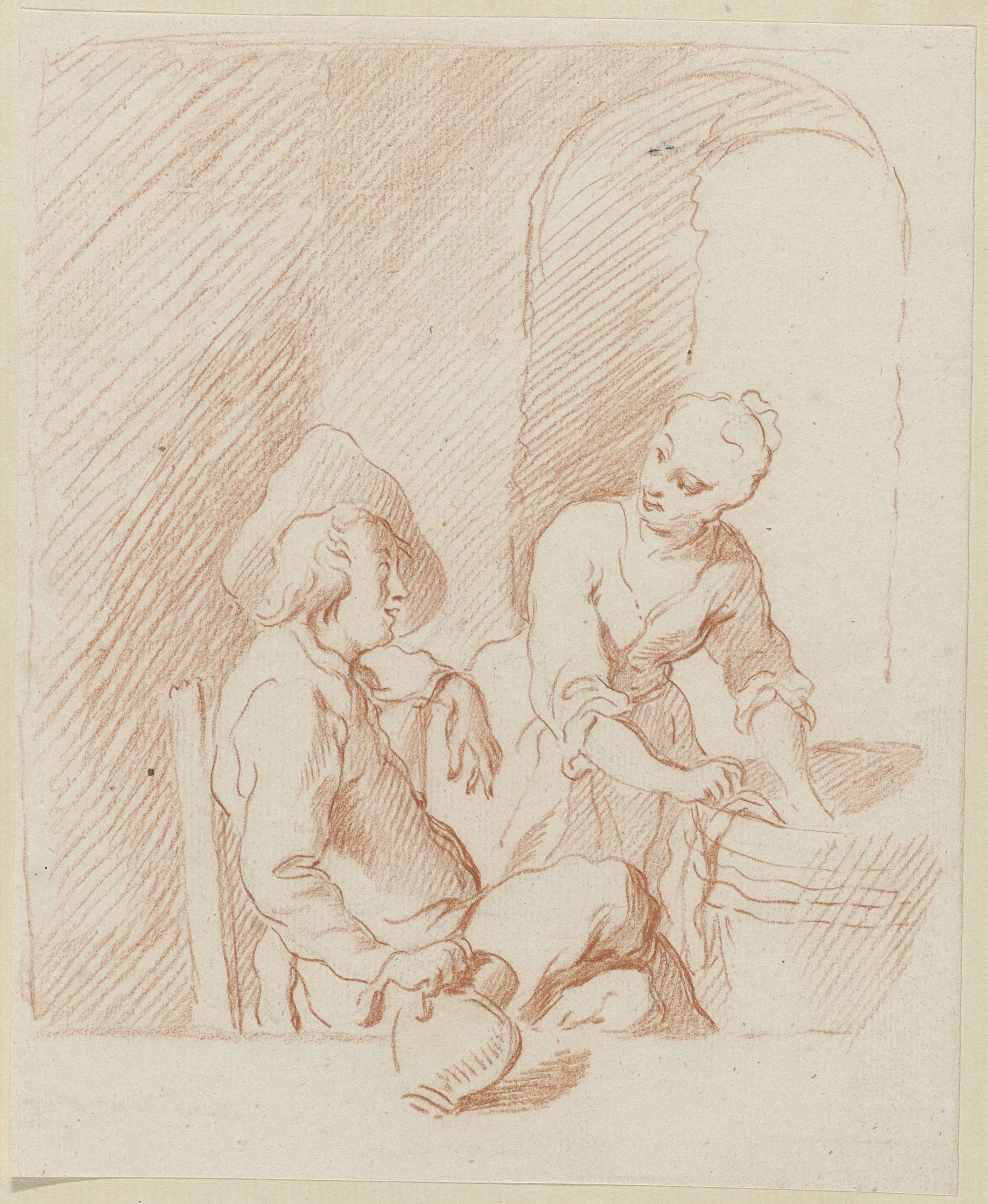 Zittende man met kruik bij staande vrouw met mand