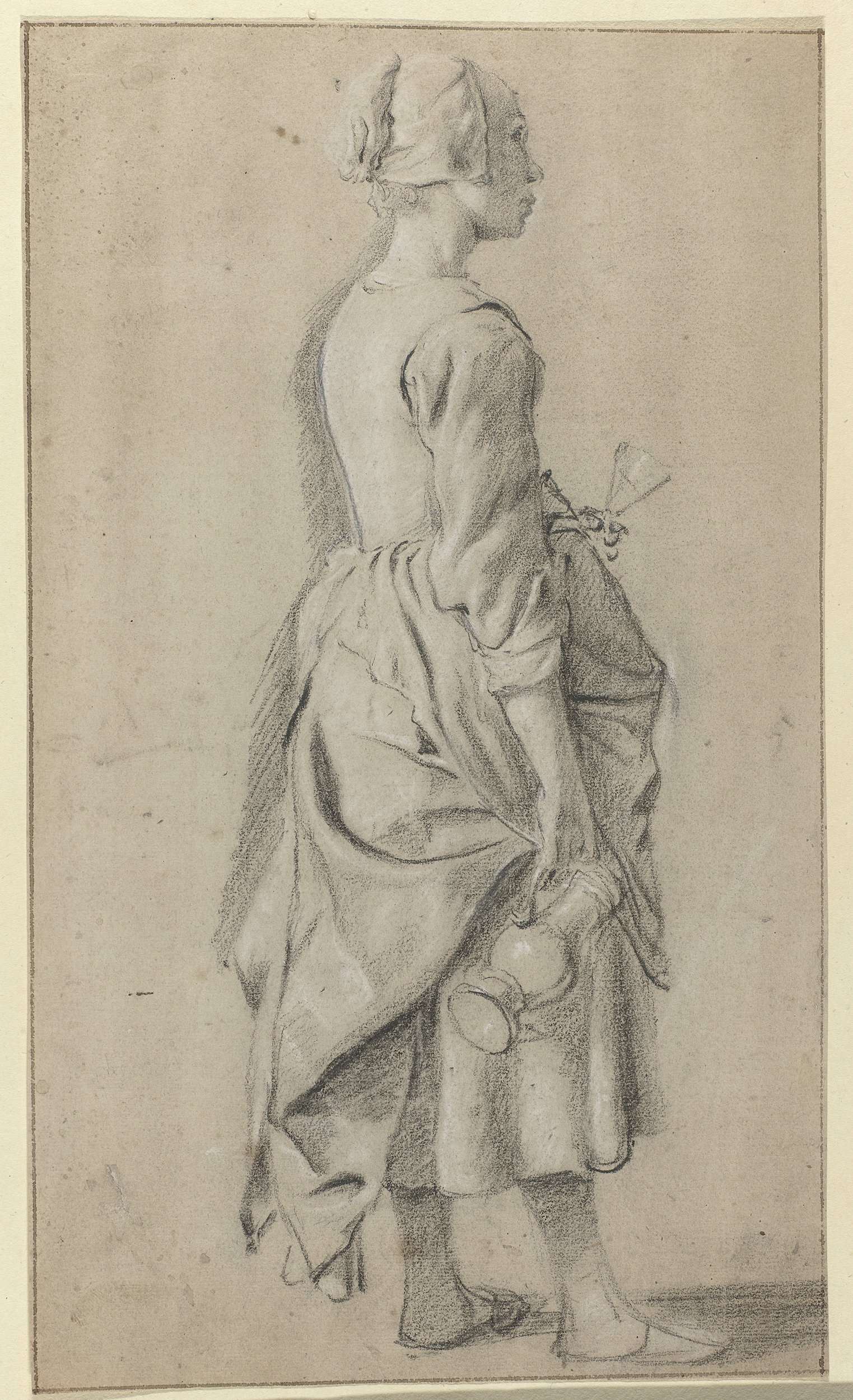 Staande vrouw van opzij gezien, met een glas in haar linkerhand en een kan in haar rechterhand