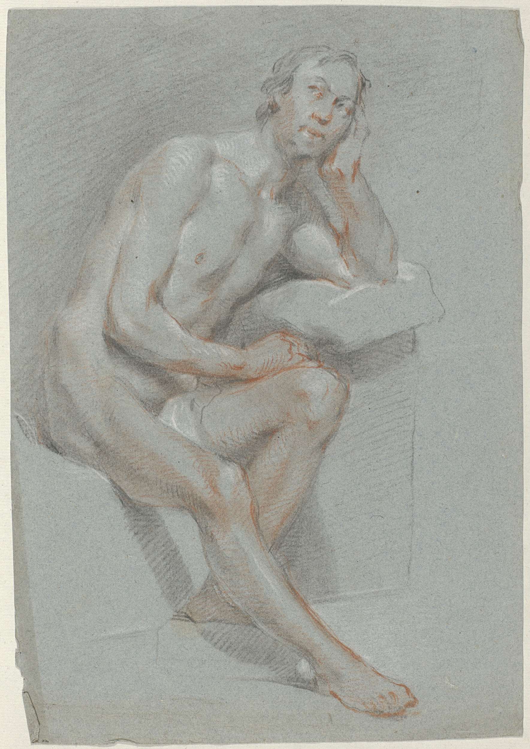Zittende naakte man, zijn hoofd met zijn hand ondersteunend