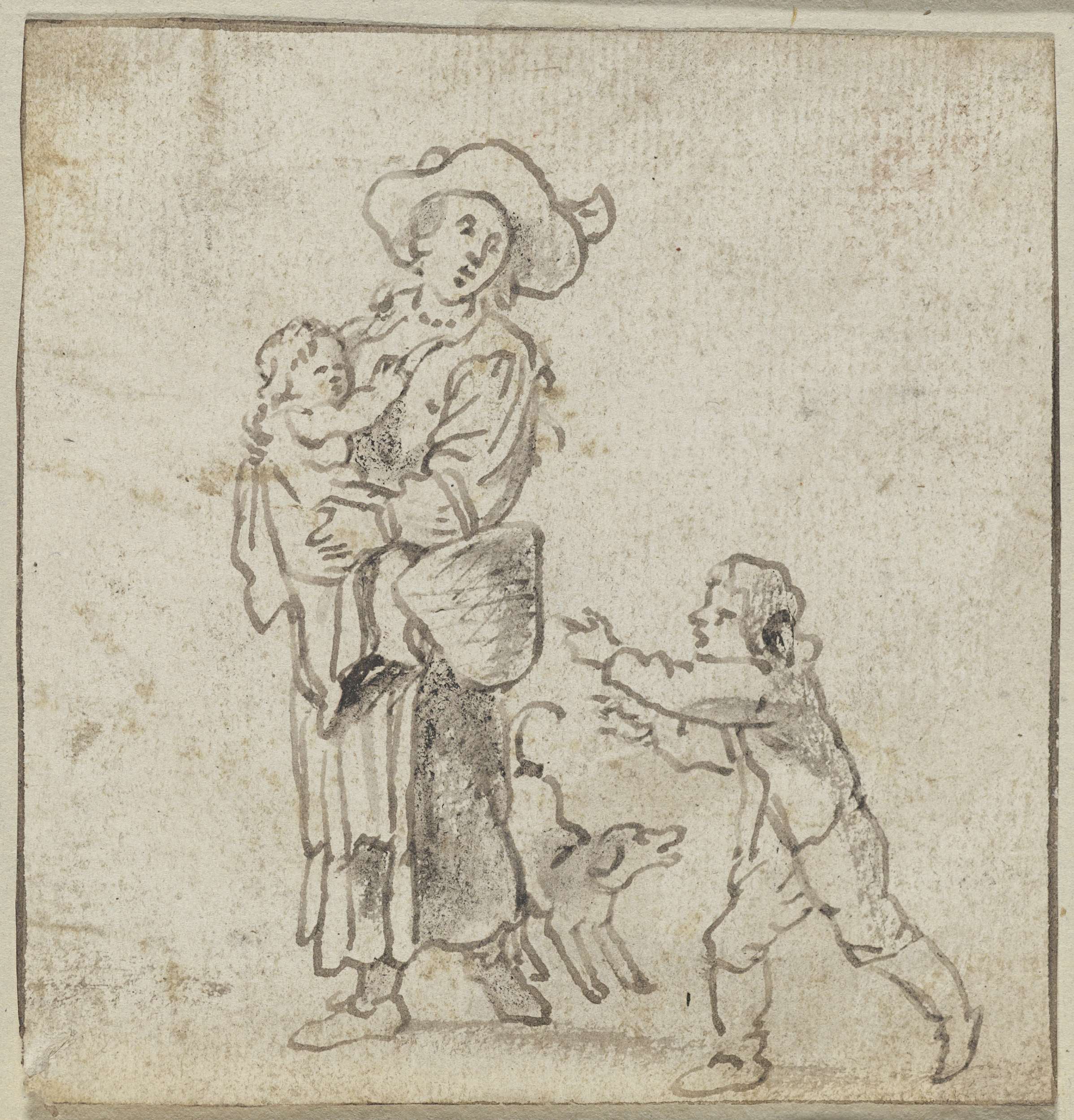 Staande vrouw met een kind in haar armen met nog een kind en een hond