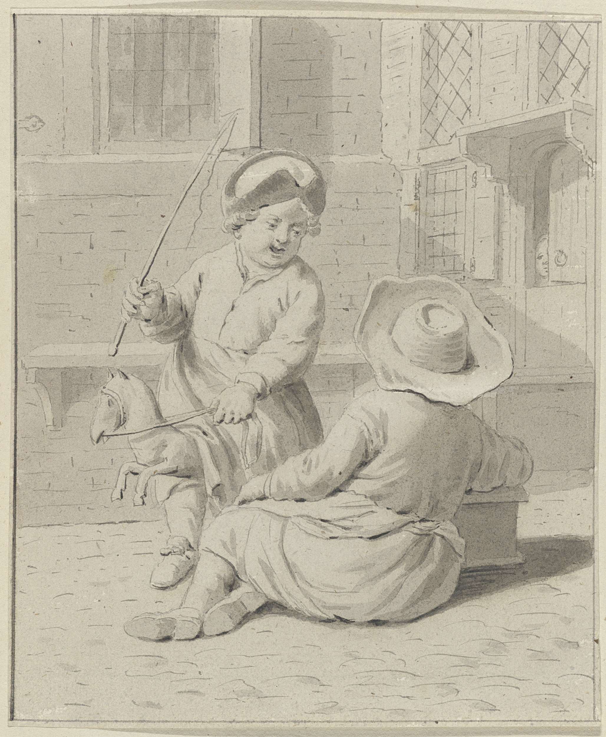 Twee kinderen op straat met een speelgoedpaard, een stoof en een zweep