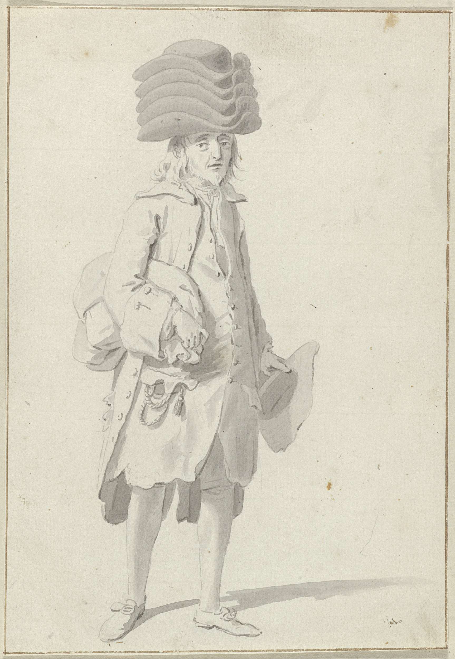 Staande man met vijf hoeden op zijn hoofd en één in zijn hand