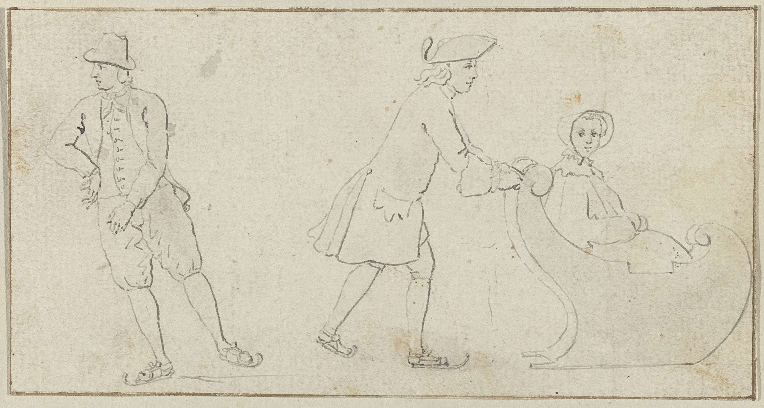 Twee mannen op schaatsen, één achter een slee met daarin een vrouw