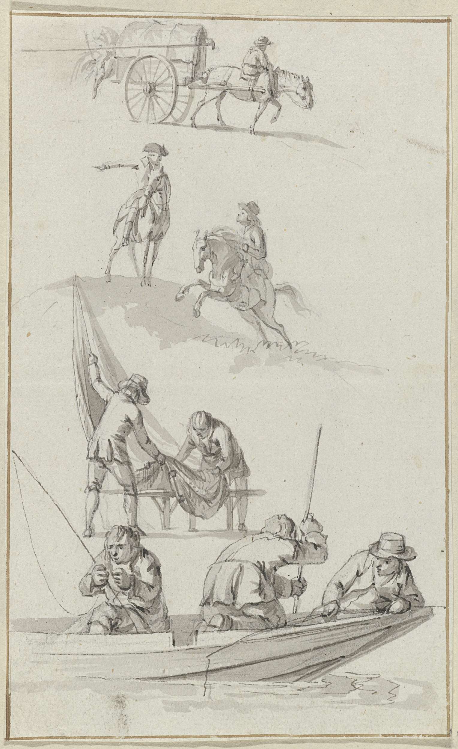 Onder elkaar vier scènes. De bovenste toont een wagen met paard met ruiter. Daaronder twee ruiters, dan twee mensen staand aan een tafel met een groot stuk textiel. De onderste scène toont drie vissers in een boot.