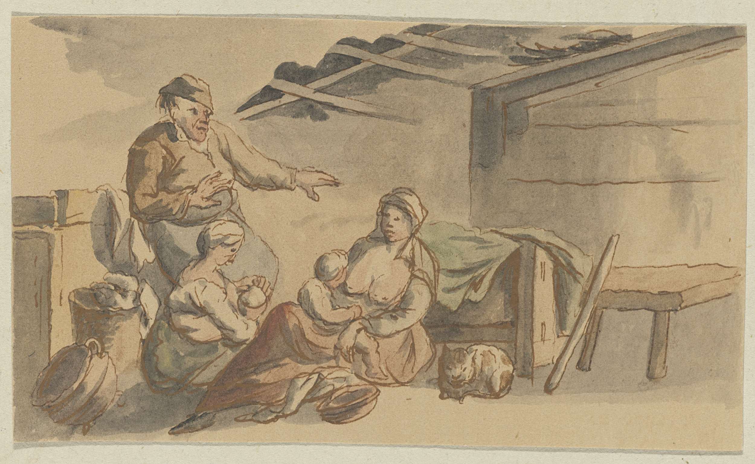 Interieur met twee voedende vrouwen, twee kinderen, een man en een kat