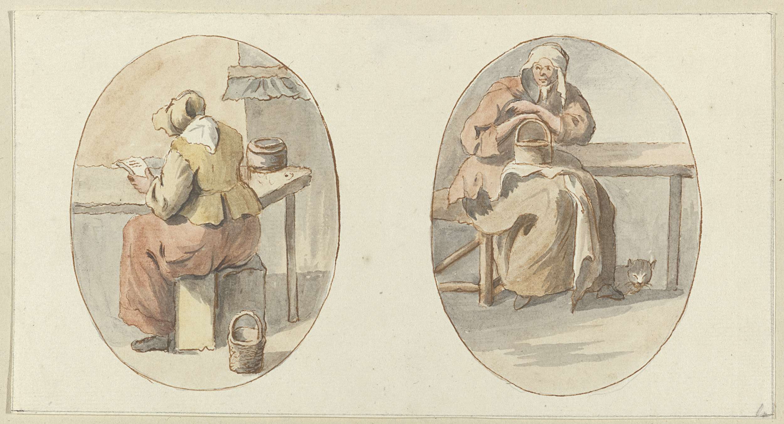 In twee staande ovalen elk een tekening. In de linkerovaal een zittende lezende vrouw. In de rechterovaal een zittende vrouw met een kat aan haar voeten.