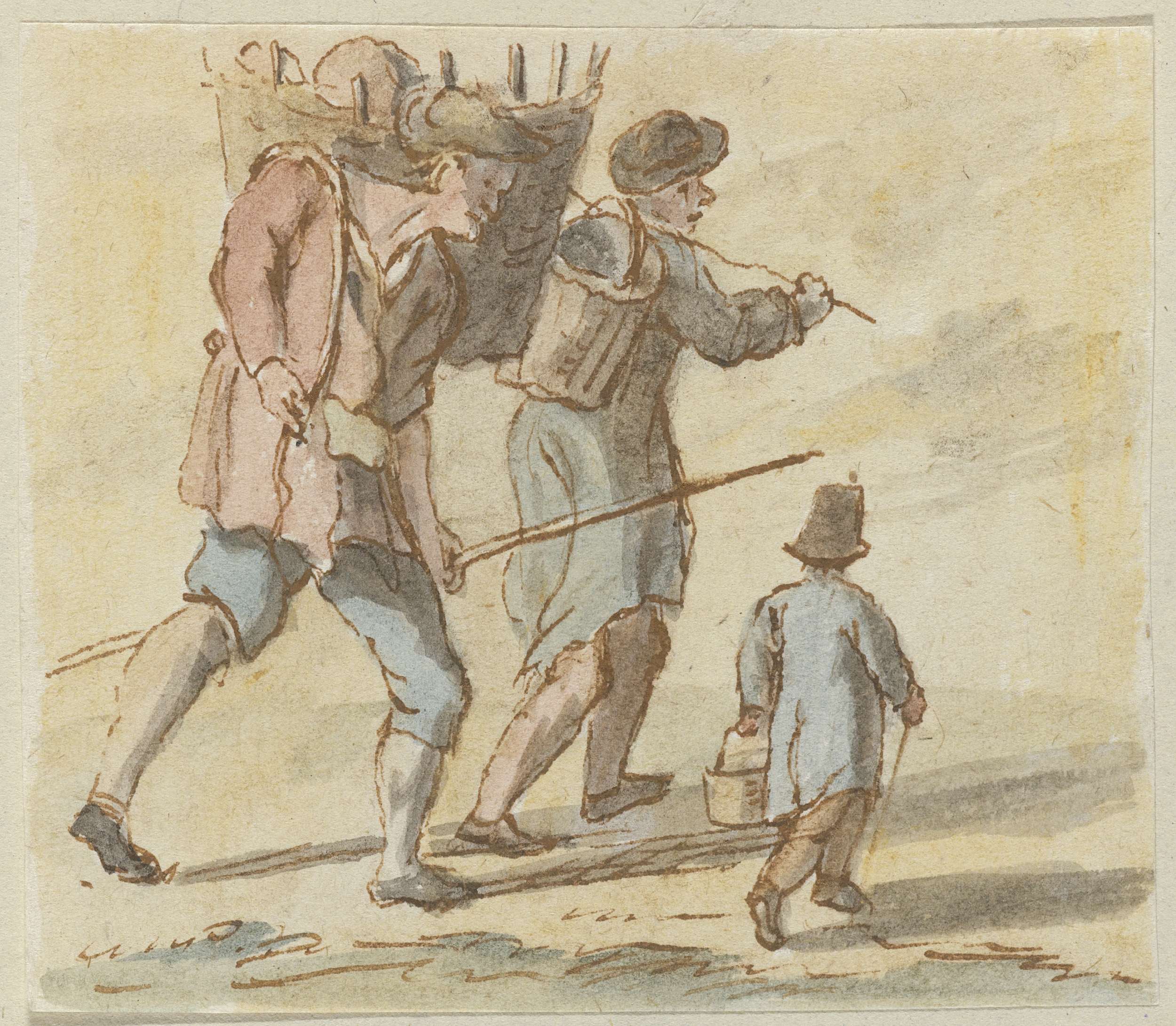 Twee lopende mannen met een mand op de rug en een kind met een mand in de hand