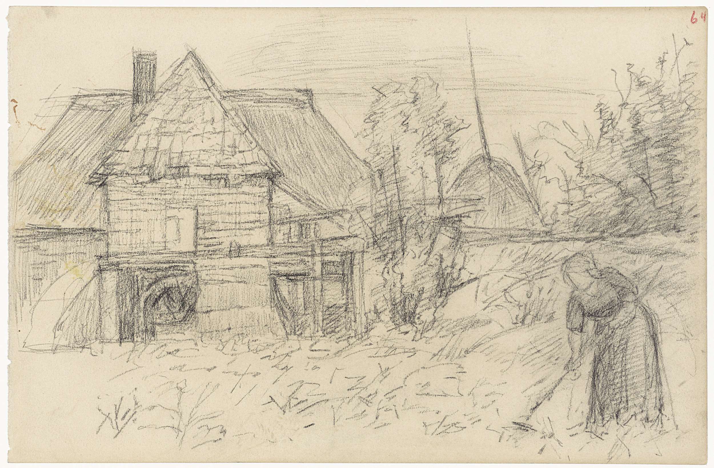 Watermolen met harkende vrouw