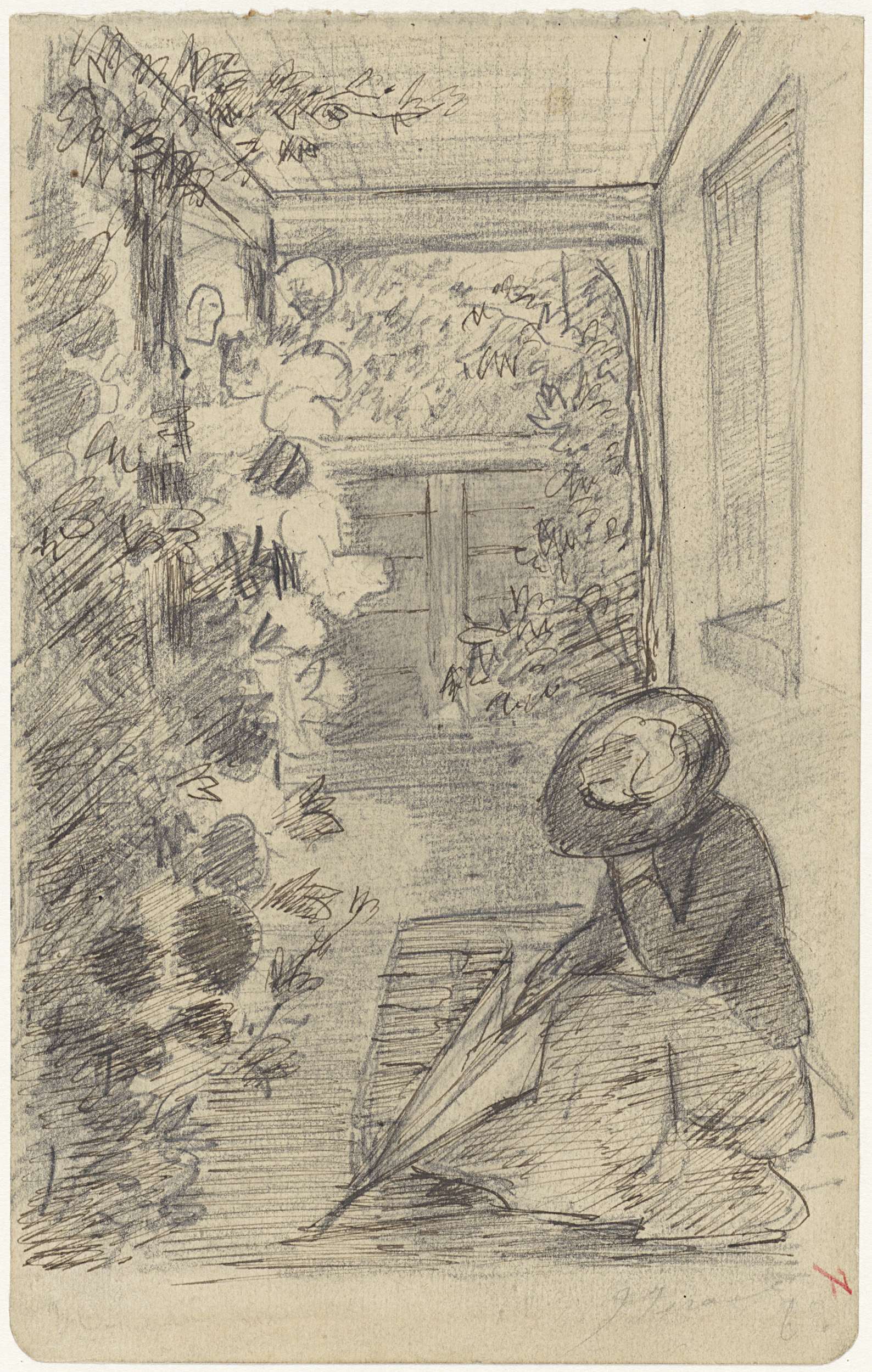 Zittende vrouw met een hoed en een parasol.