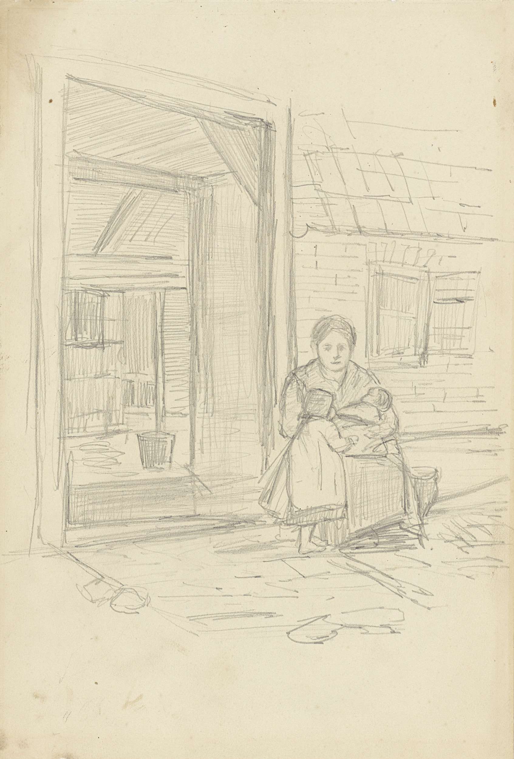 Zittende vrouw en twee kinderen voor de deur van een schuur