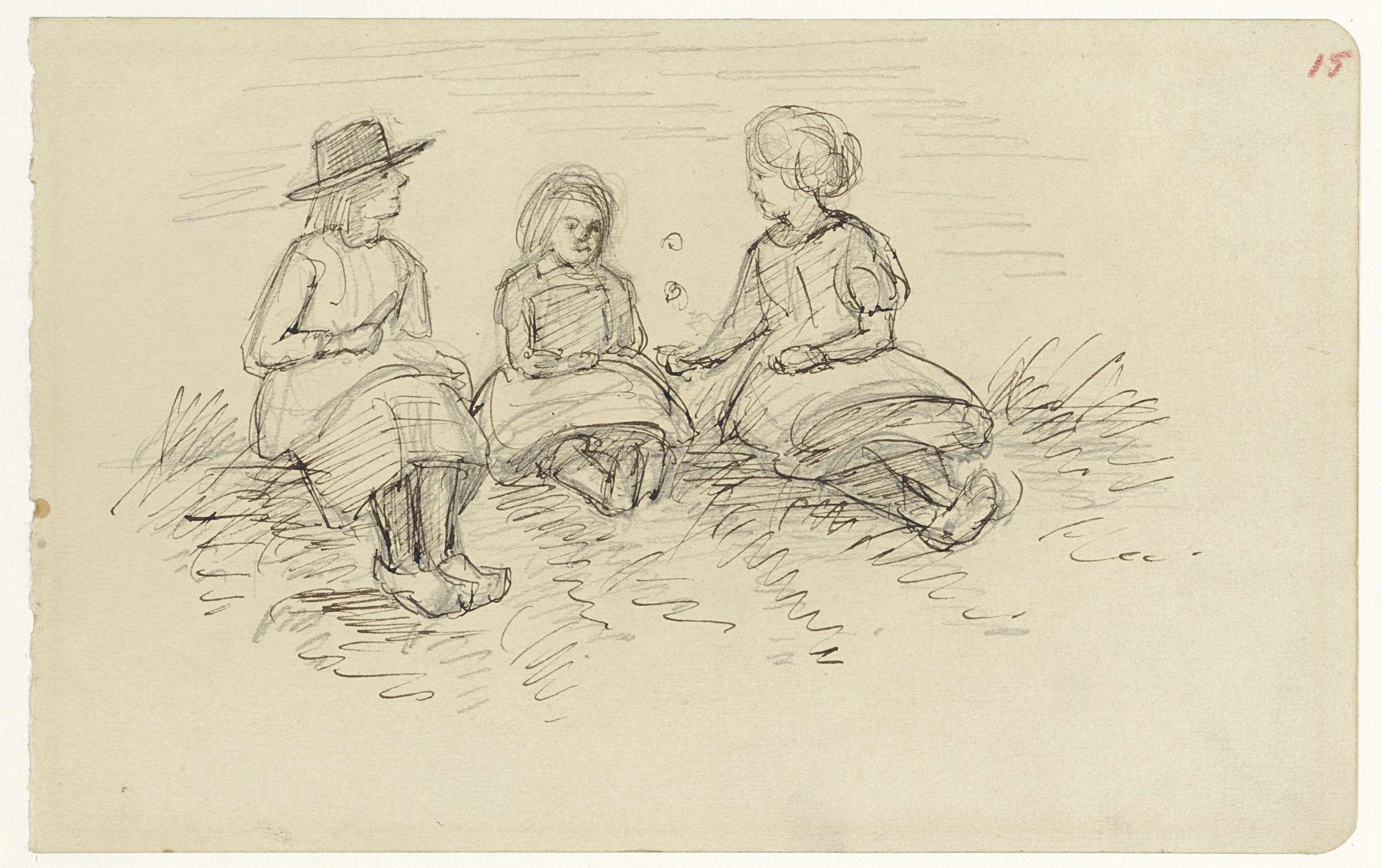 Drie zittende kinderen in het gras