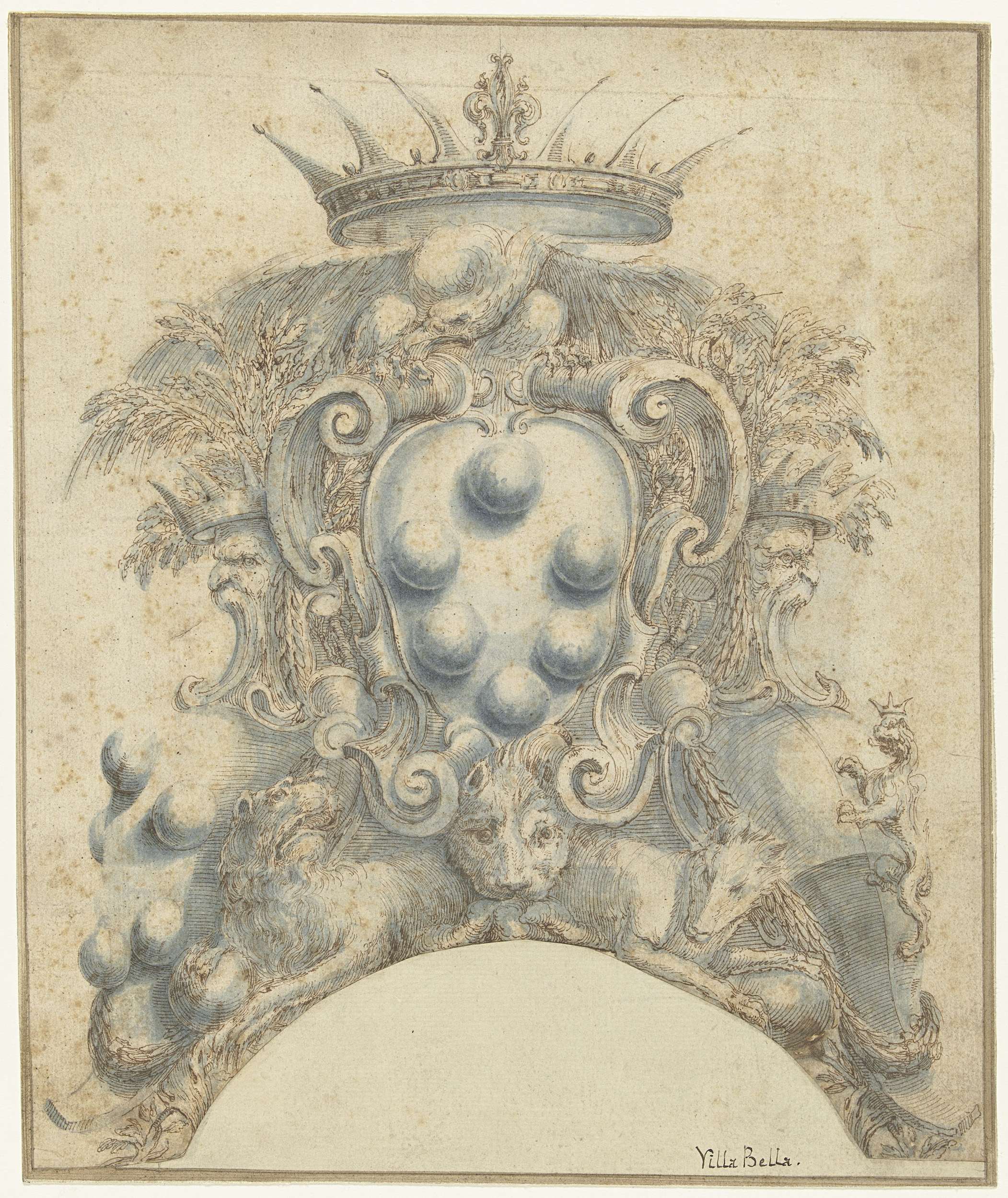 Het wapen van de familie Medici, geflankeerd door twee alliantie-wapens, met de heraldische dieren.