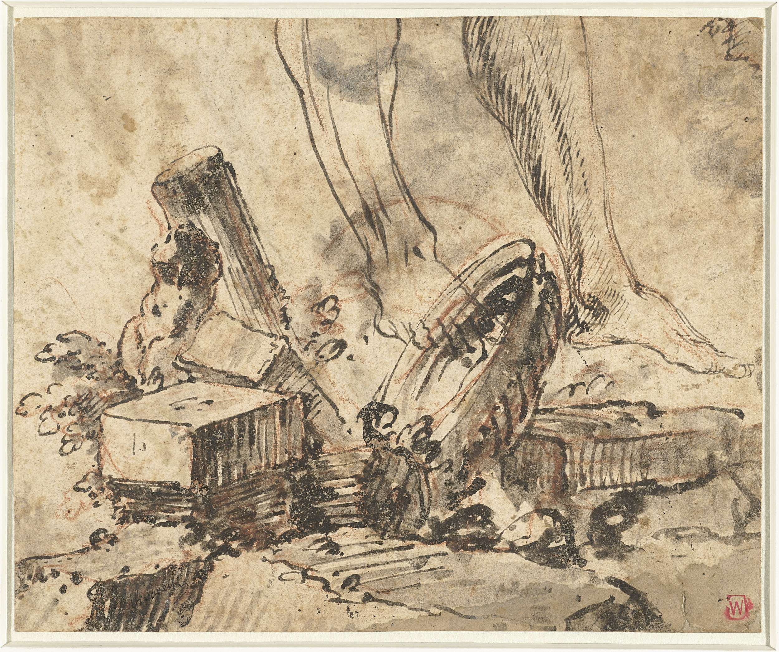 Marmerblokken, een antieke torso en een schaal, overgroeid door planten, getekend over de benen van een naaktfiguur.