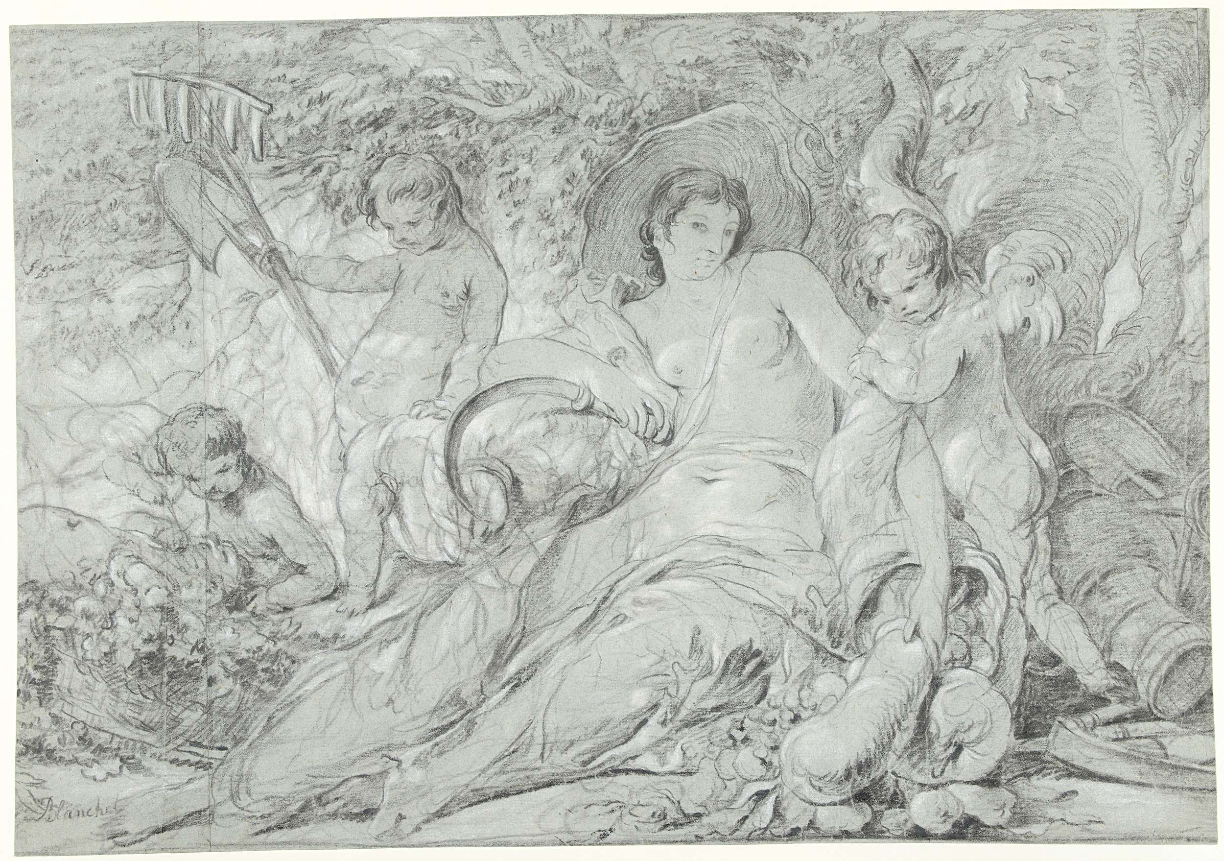 Een vrouw met een sikkel en een hoorn des overvloeds omringd door putti, één met een hark en een schop.
