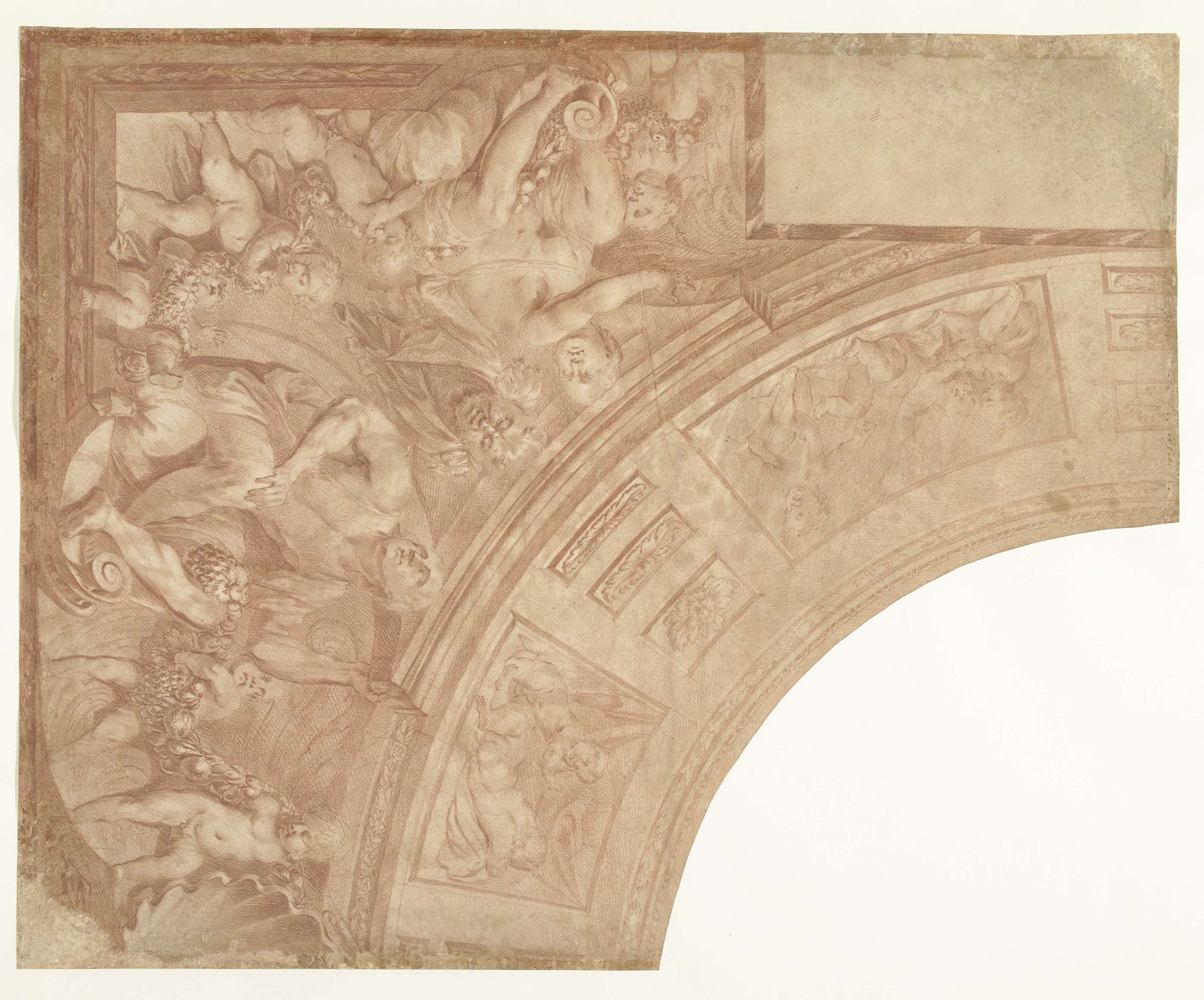 Ontwerp voor een hoekstuk van een plafond met zittende figuren, putti en buste van een sater
