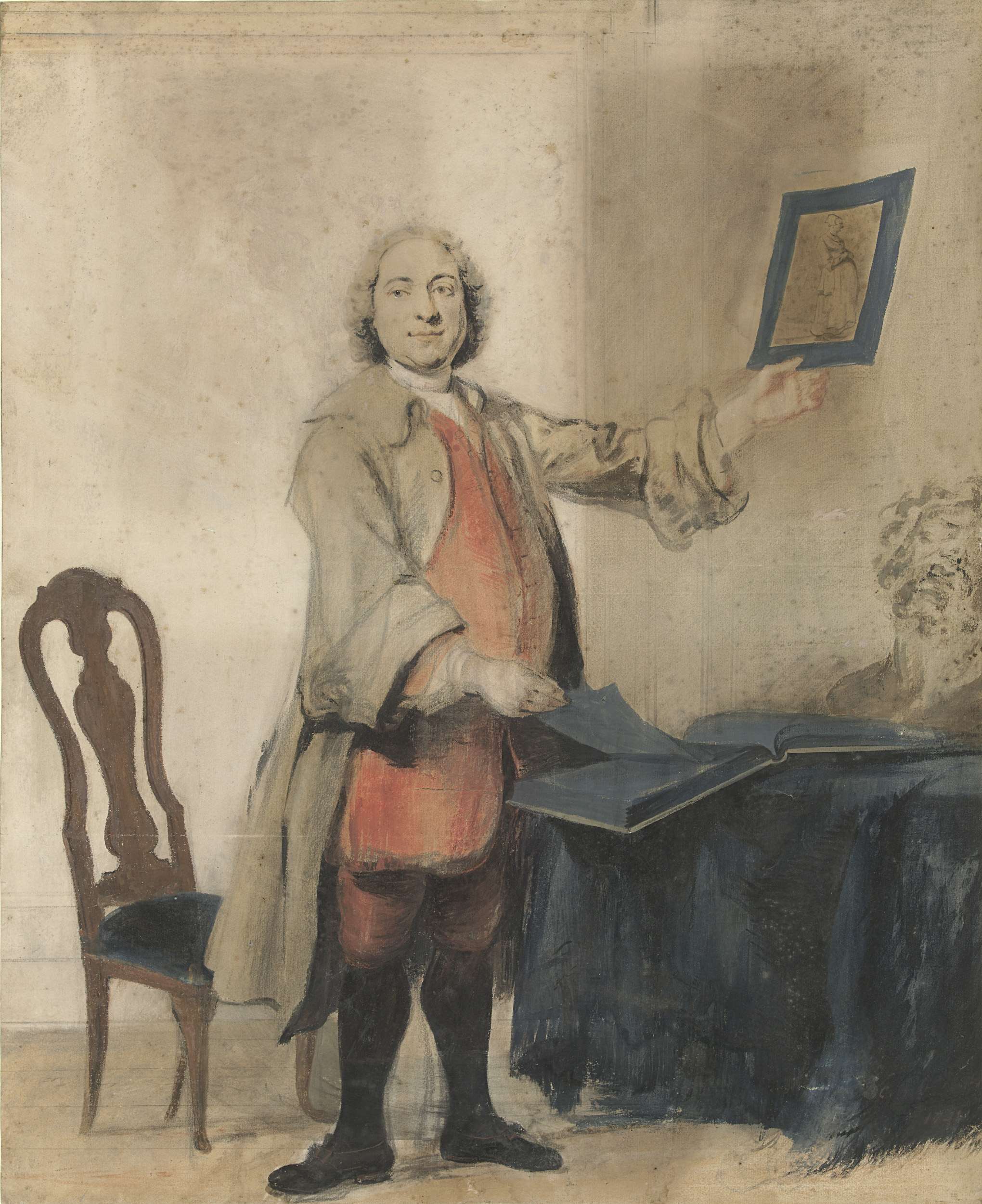Portret van Cornelis Bouman ten voeten uit met een tekening in de linkerhand, bij een tafel met een opengeslagen kunstboek.