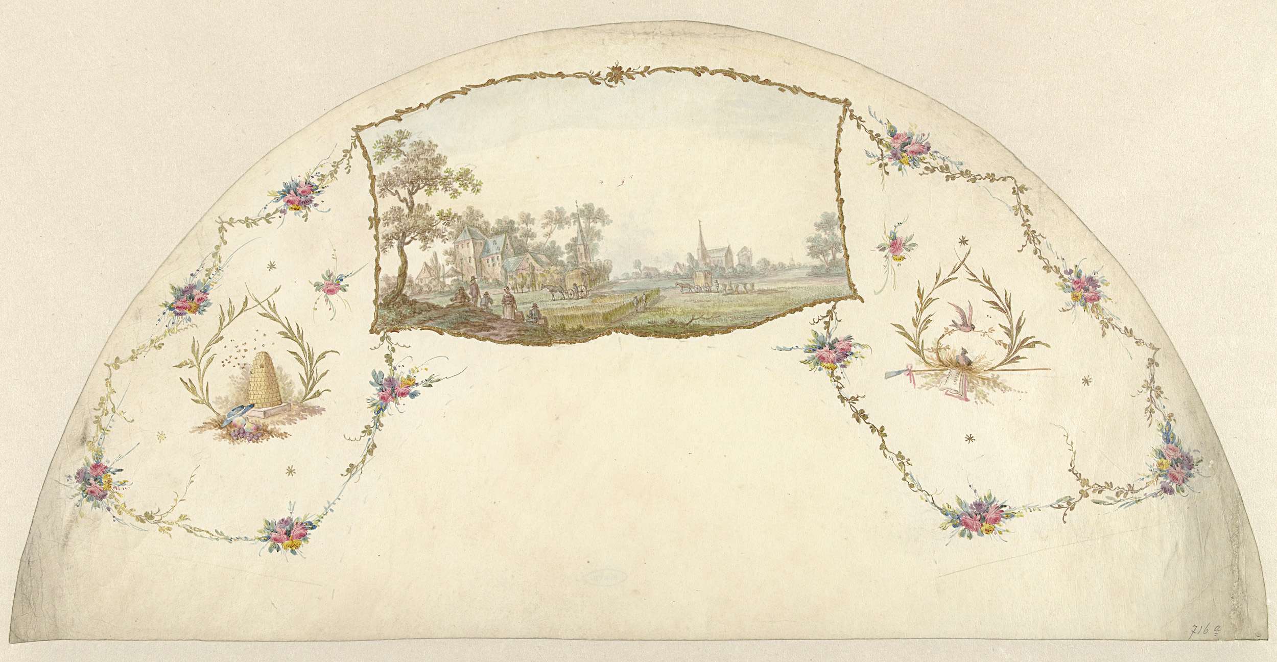 Het bovenste waaierblad is een ode aan het zomerse landleven: net buiten de dorpsrand wordt gehooid en twee vogels hangen rond bij hun nest. Het is een vredig tafereel, maar er wordt ook verwezen naar het harde werk met de bijenkorf als prominent symbool voor ijver. Op het onderste blad reiken putti een vrouw bloemen ...