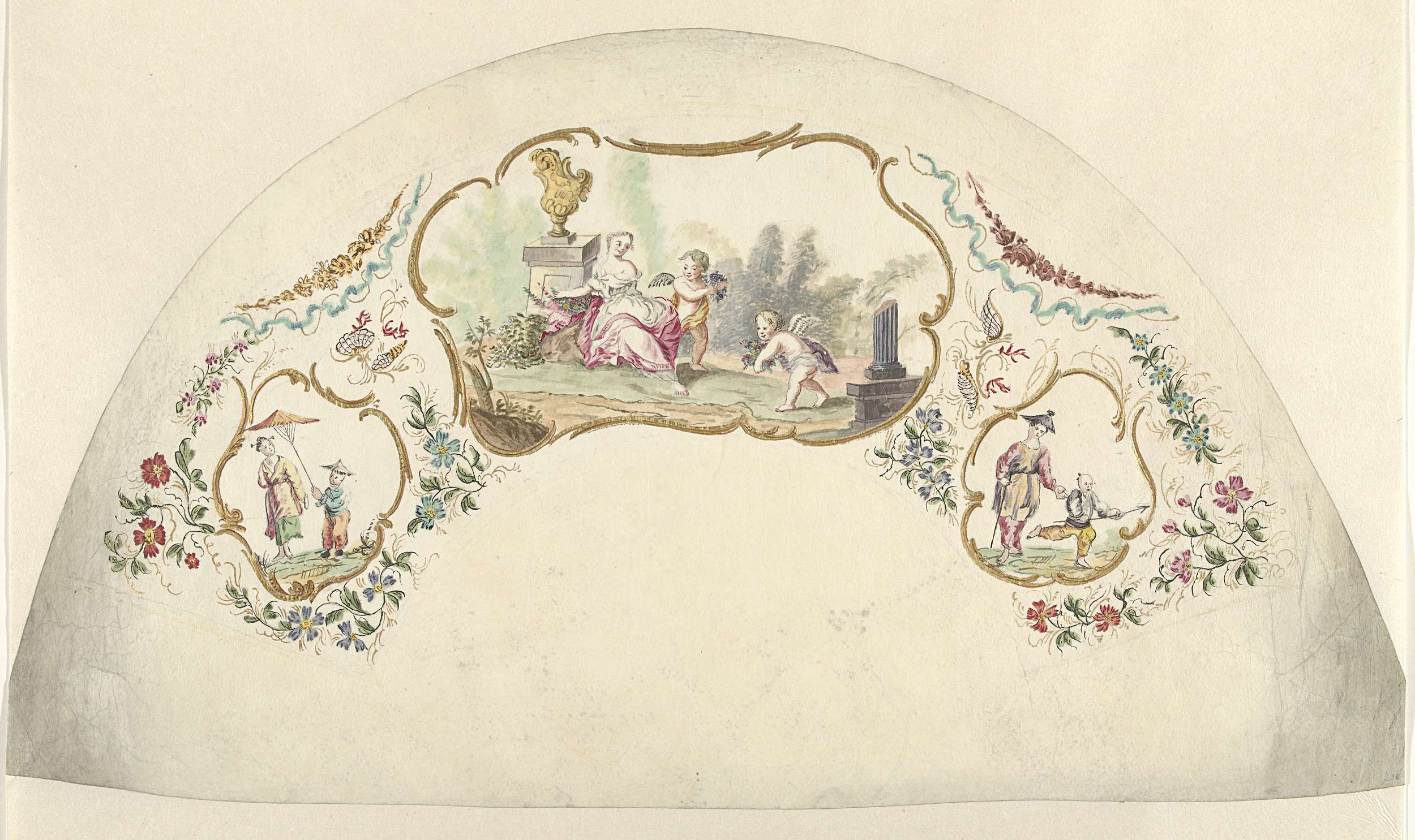 Het bovenste waaierblad is een ode aan het zomerse landleven: net buiten de dorpsrand wordt gehooid en twee vogels hangen rond bij hun nest. Het is een vredig tafereel, maar er wordt ook verwezen naar het harde werk met de bijenkorf als prominent symbool voor ijver. Op het onderste blad reiken putti een vrouw bloemen ...