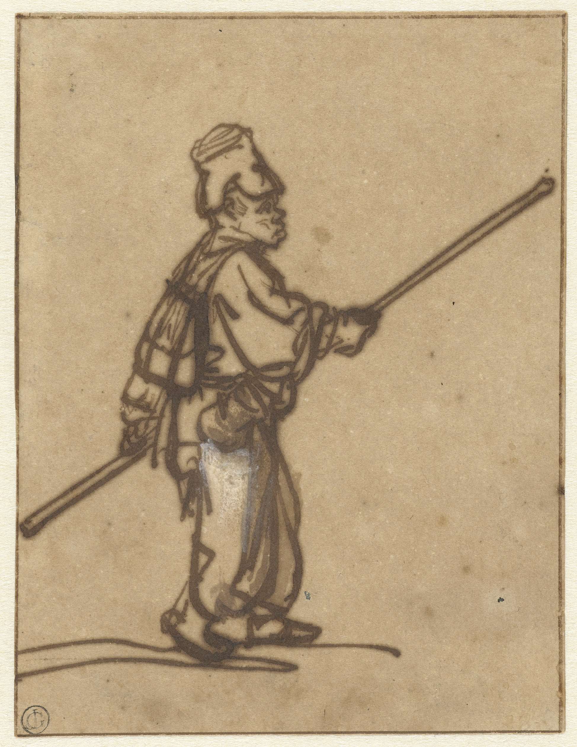 Waarom dit knaapje een stok vasthoudt is onduidelijk. Mogelijk tekende Rembrandt een lepralijder, die de stok moest dragen als waarschuwing voor zijn gezonde medeburgers. Rembrandt maakte de stok expres niet helemaal recht; zo oogt deze juist geloofwaardig. Hij gebruikte ijzergallusinkt, berucht om het aantasten van papier, de zogenoemde inktvraat.