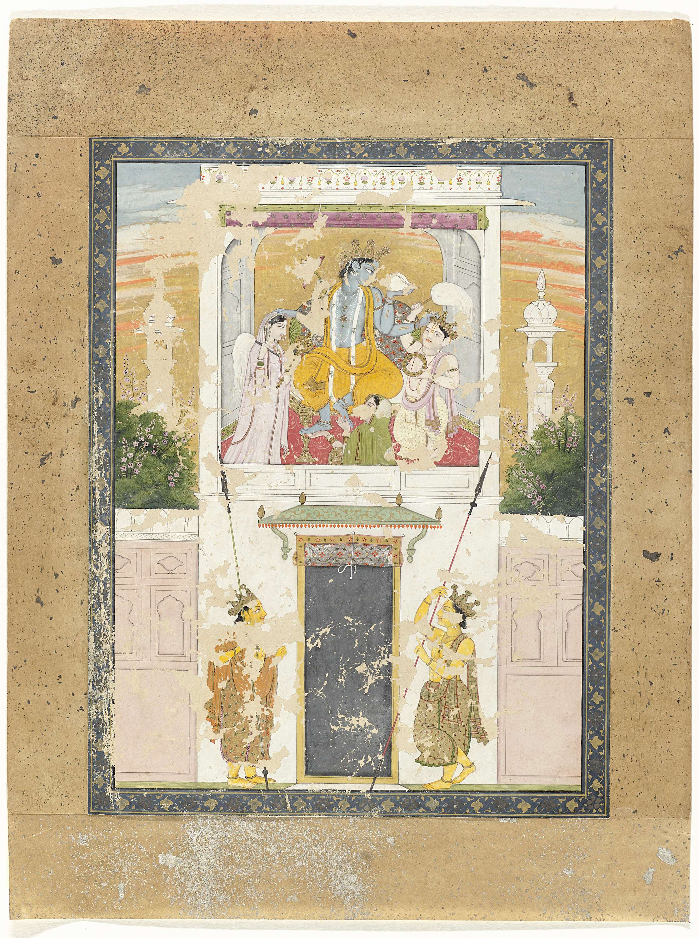 Vishnu zittend op een troon op de eerste verdieping van een gebouw