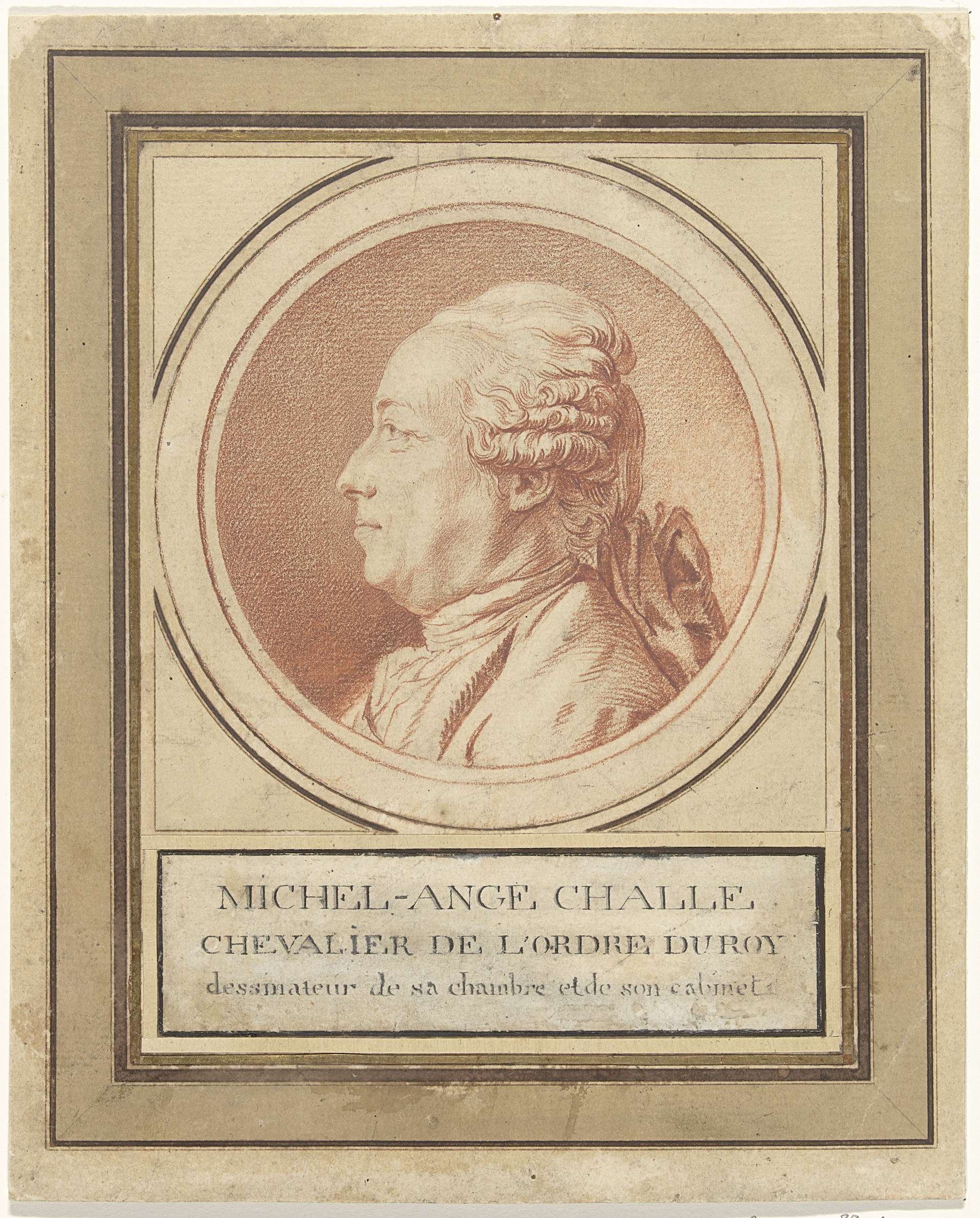 Vanaf ongeveer 1760 waren dit soort portretten in profiel in een medaillon heel populair in Frankrijk. Trinquesse tekende graag met rood krijt en daarmee portretteerde hij ook zijn collega Challe (wiens tekeningen hier vlakbij te zien zijn). Met zorgvuldige streken modelleerde hij de huidplooien in het gezicht en de krullenpruik. De omlijsting met Challe’s naam ...