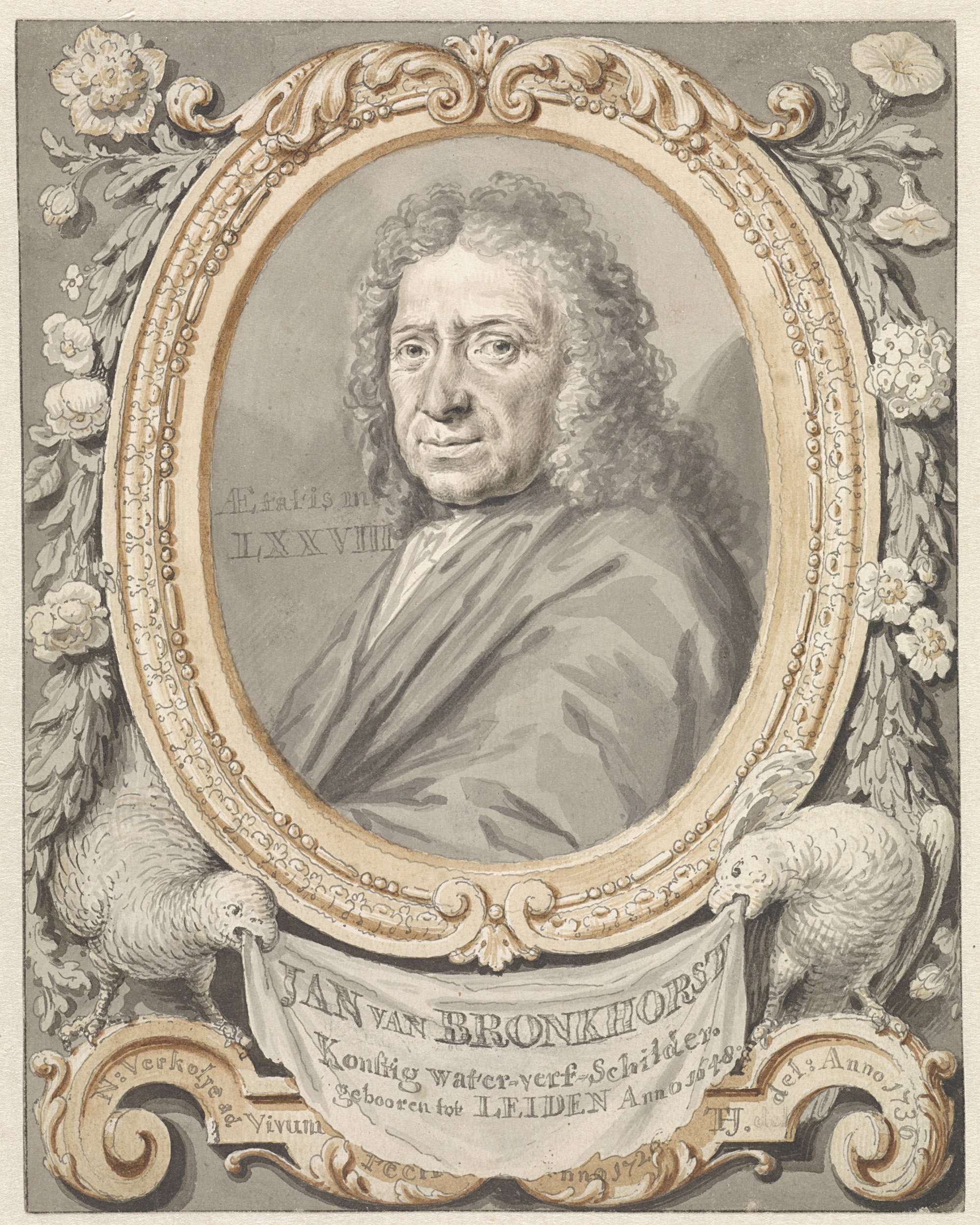Portret van Johannes (Jan) van Bronkhorst in omlijsting met bloemen en twee vogels