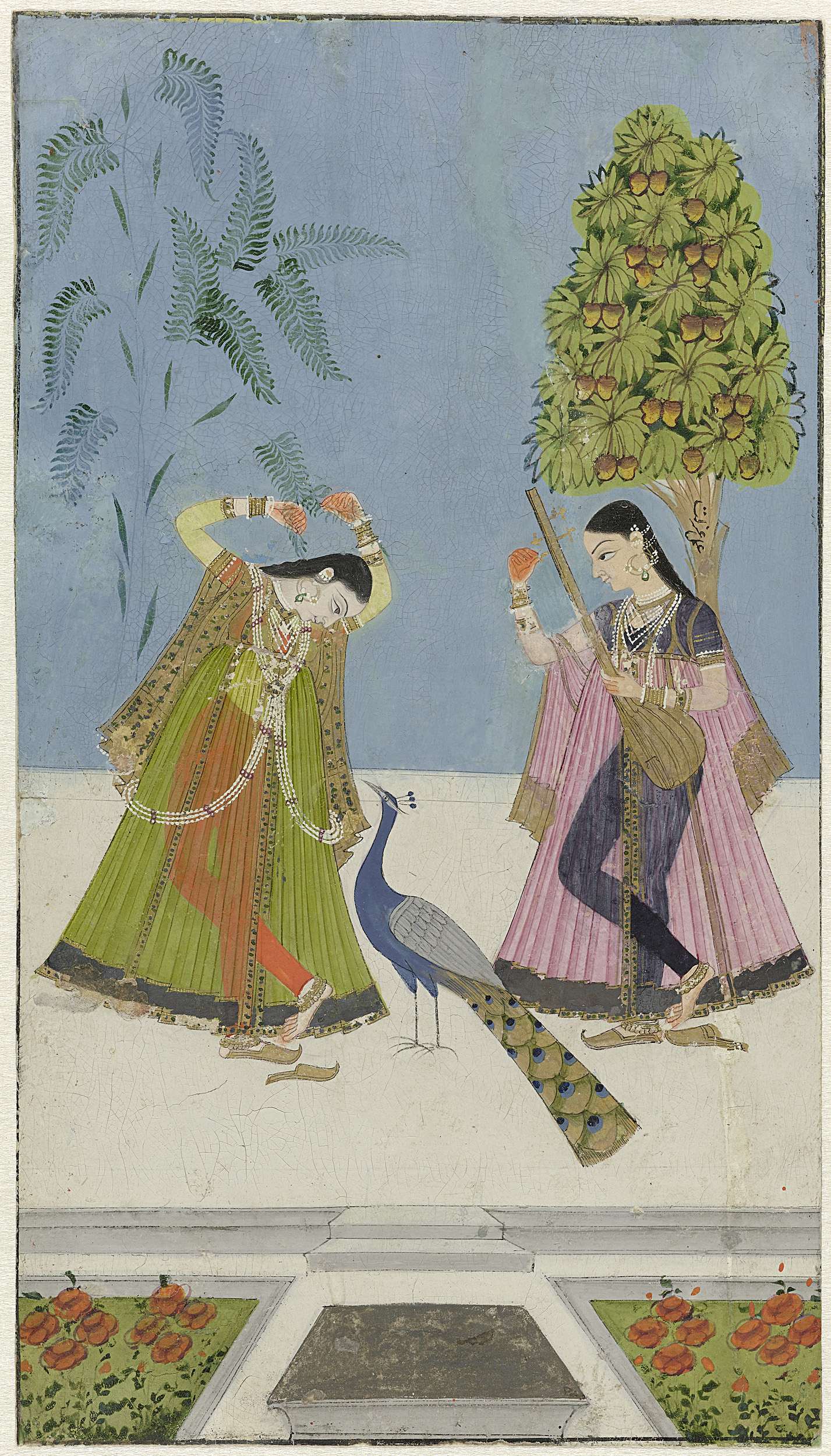 Twee vrouwen staan ieder onder een boom. De rechter stemt de tanpura onder een vruchtdragende mango-boom. De linker houdt zich aan de twijg van een boom vast, terwijl ze naar een pauw kijkt.