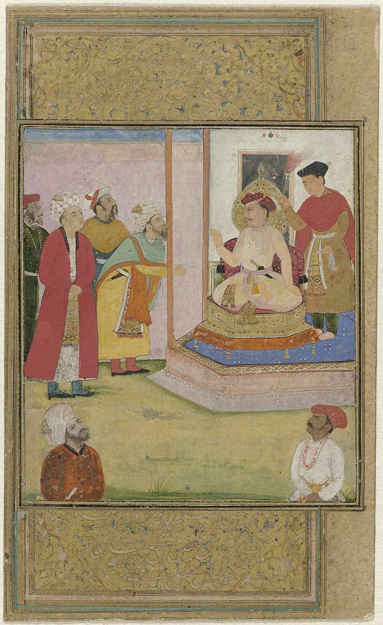 Op een troon zit een vorst, gekleed in een doorzichtige, witte jama. Over zijn rode tulband is een parelsnoer gehangen. En dienaar staat achter hem en wuift hem koelte toe. Voor de troon staan vier mannen, waarvan de voorste een verzoek aan de vorst doet. Rond de voorstelling kaderlijntjes, ingekleurd in groen en goud, boven- ...