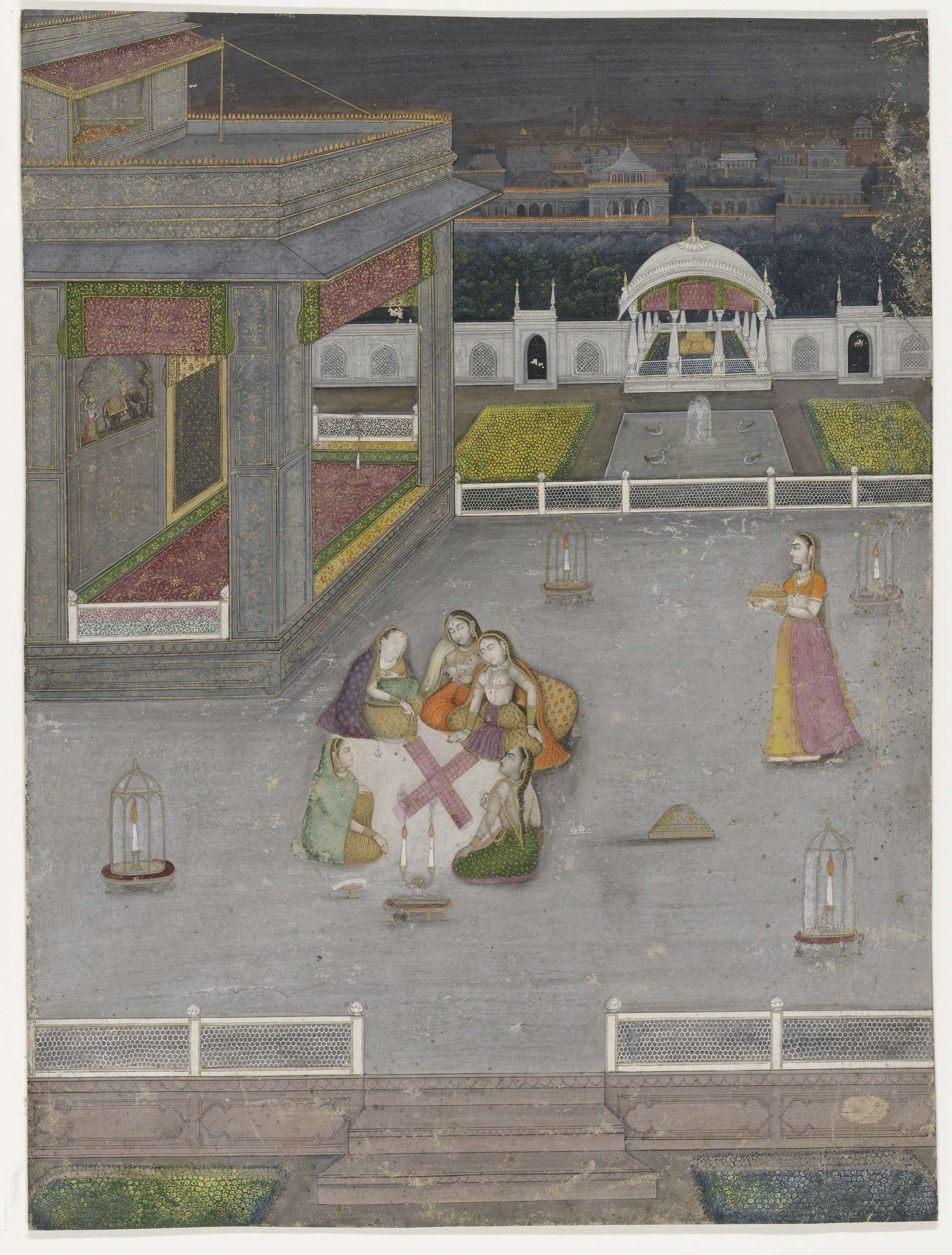 Op een ruime binnenplaats van een paleis spelen vier vrouwen een bordspel. De vrouw rechts vooraan heeft drie langwerpige dobbelstenen in de hand, klaar om te werpen. De vrouw rechts van haar zit geleund tegen een rolkussen. Zij is de belangrijkste dame. Het spel dat hier gespeeld wordt heet Chaupar of Pacisi. Het is nacht, ...