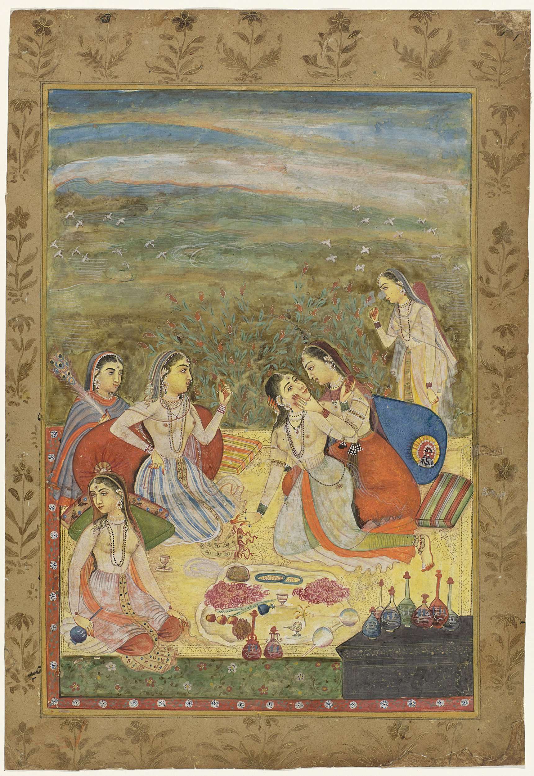 Schilderingen waar vrouwen feest vieren en intiem zijn met elkaar waren populair bij Europeanen. Het idee van de ‘exotische’ harem als een plek van sensuele loomheid, waar jonge vrouwen als seksobjecten een afgezonderd leven leiden, sloot aan bij de oriëntalistische verbeelding van India. Eigentijdse memoires en reisverslagen geven echter een veel complexer beeld van het ...