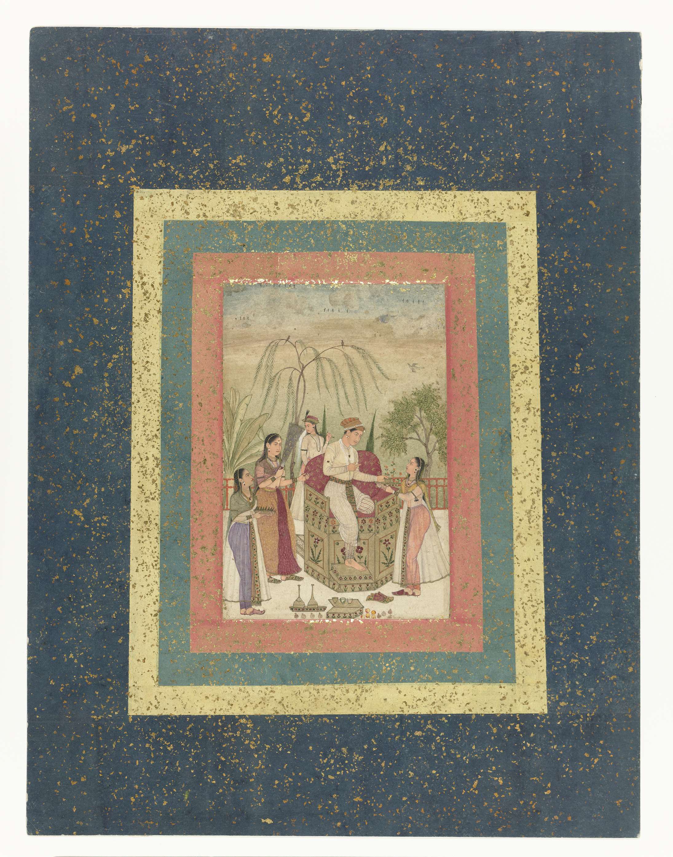 In het midden zit een prins op een octagonale gouden troon met rode kussens en krijgt van een dame rechtsd een kopje aangereikt, twee dames links staan klaar met andere gaven en op de achtergrond achter de troon staat een dienares klaar; op de voorgrond voor de troon staan nog meer gaven en de slippers ...