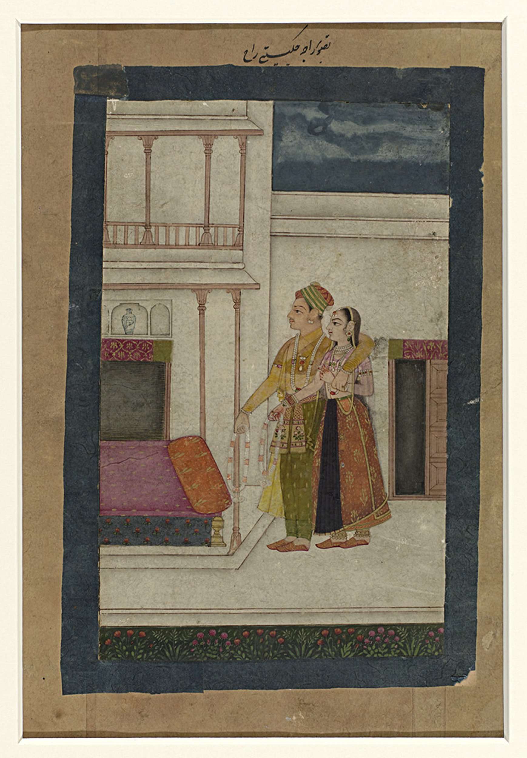 Een paar loopt samen naar een gereedstaand bed toe; de man heeft zijn linkerarm om de schouders van de vrouw geslagen en houdt haar linkerarm vast; in de rechterhand dragen beiden een wit-rode ketting. De voorstelling is op een stuk grauw karton geplakt en omraamd door donkergroene stroken papier.
