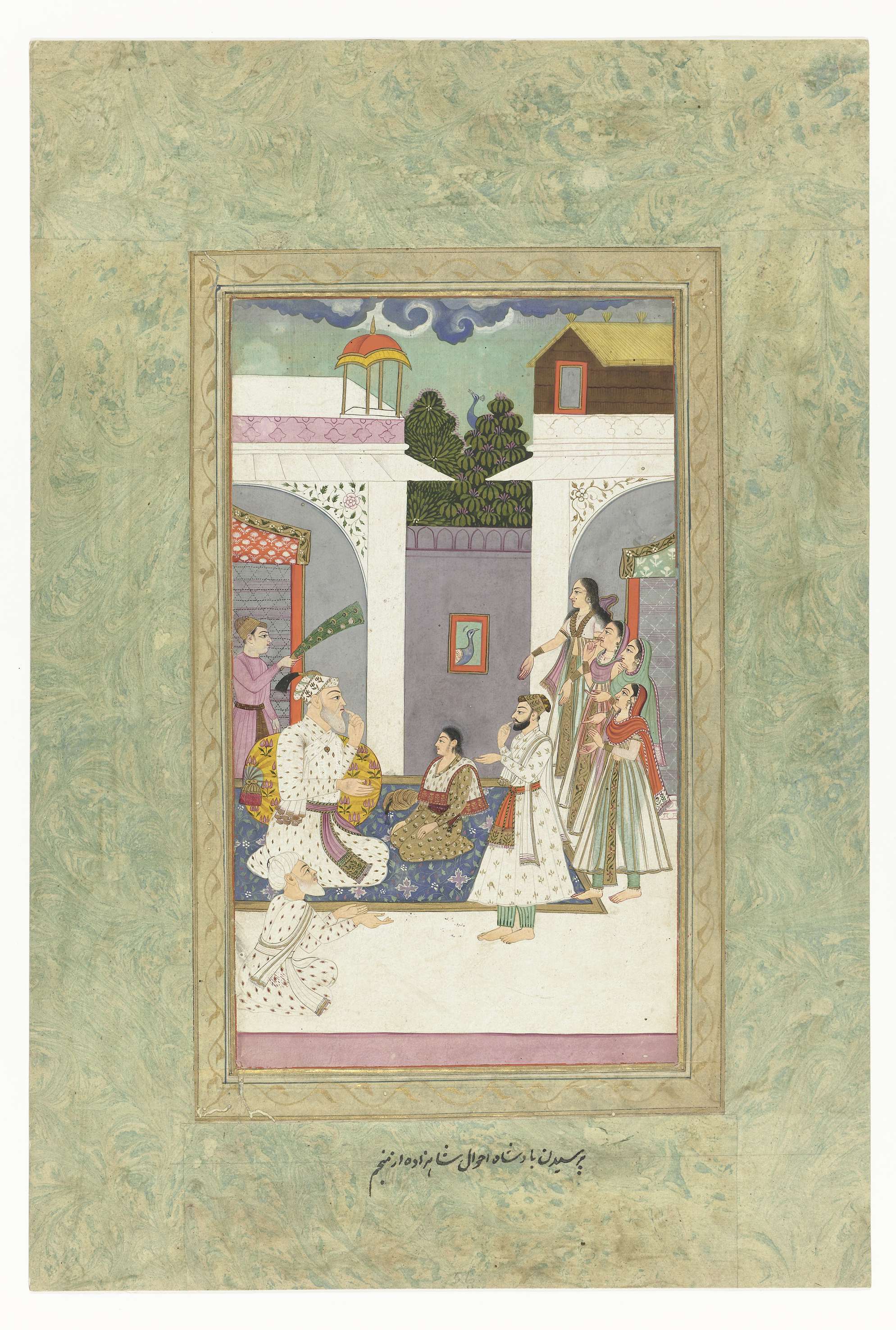 De voorstelling met een astroloog is omrand met twee sierranden, een in beige met goudranken en zwart en gouden kaderlijnen, de tweede, buitenste rand is van groen gemarmerd papier waarvan de verticale stroken op de horizontale zijn geplakt.