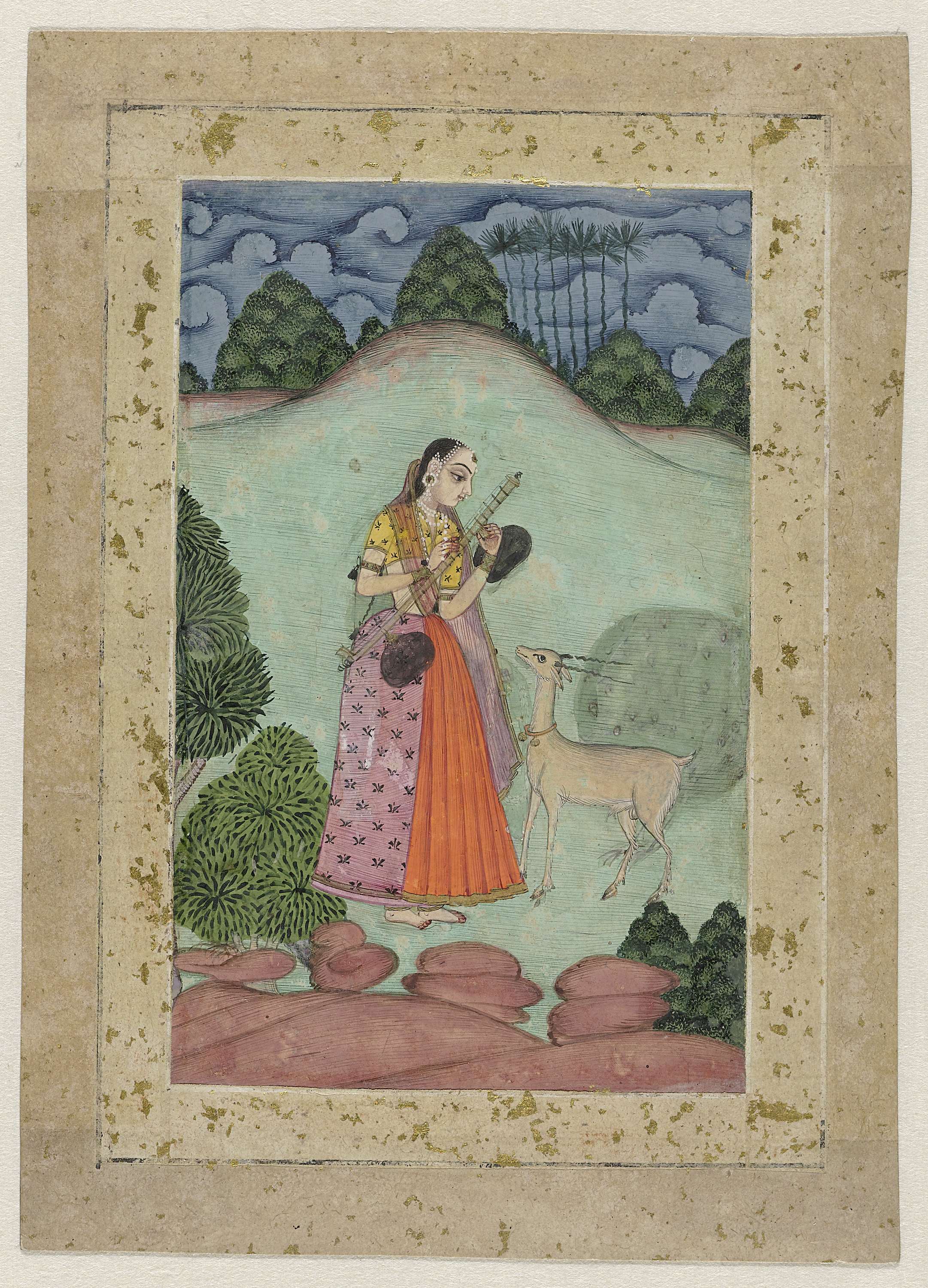 Over de voorstelling is een dun sierrandje geplakt van beige papier met goudverf bespikkeld, het geheel is op een stukje beige karton geplakt dat eveneens met goudverf is bespikkeld, tussen de twee sierranden is een dunne kaderlijn aaangebracht.