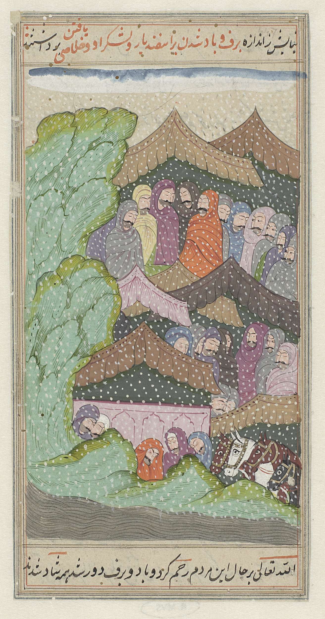 Achter een patroon van groene heuveltjes en bomen met tenten als achtergrond is een processie van drie verticale rijen halve figuren zichtbaar, op de onderste rij gevolgd door een viertal paardenkoppen. Het geheel is besprenkeld met witte stipjes die de sneeuw voorstellen. De lange smalle voorstelling is gevat in kaderlijnen in zwart, lichtbruin en rood.