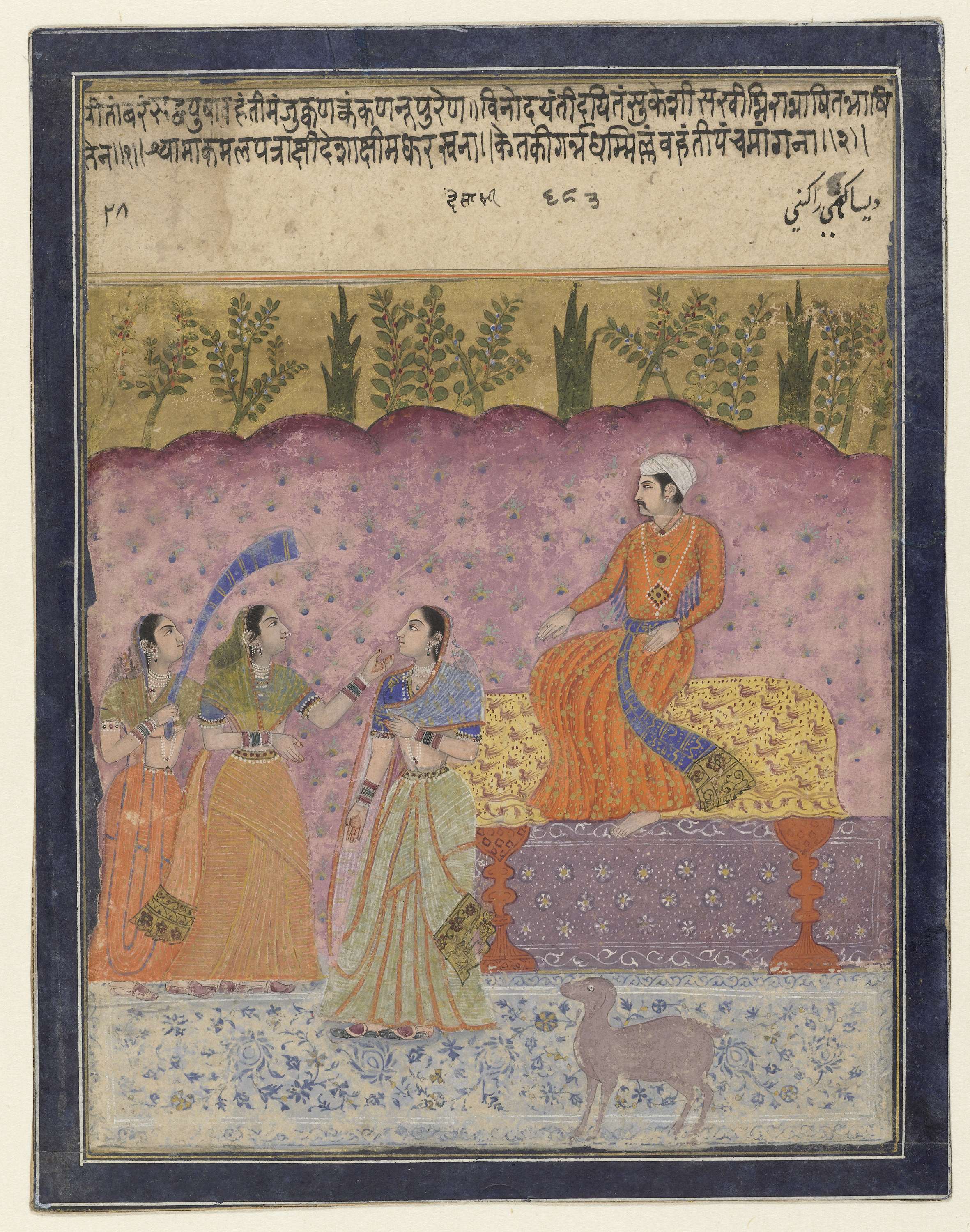 In een heuvelachtig roze landschap zit een vorst op een taboeret, links voor hem staat een jonge vrouw, twee vrouwen tegenover haar, de ene met opgeheven hand onder de kin van de jonge vrouw, rechts op de voorgrond een hond, op de achtergrond struiken en bomen in gestileerde vorm, daarboven een paar regels tekst. Rond ...