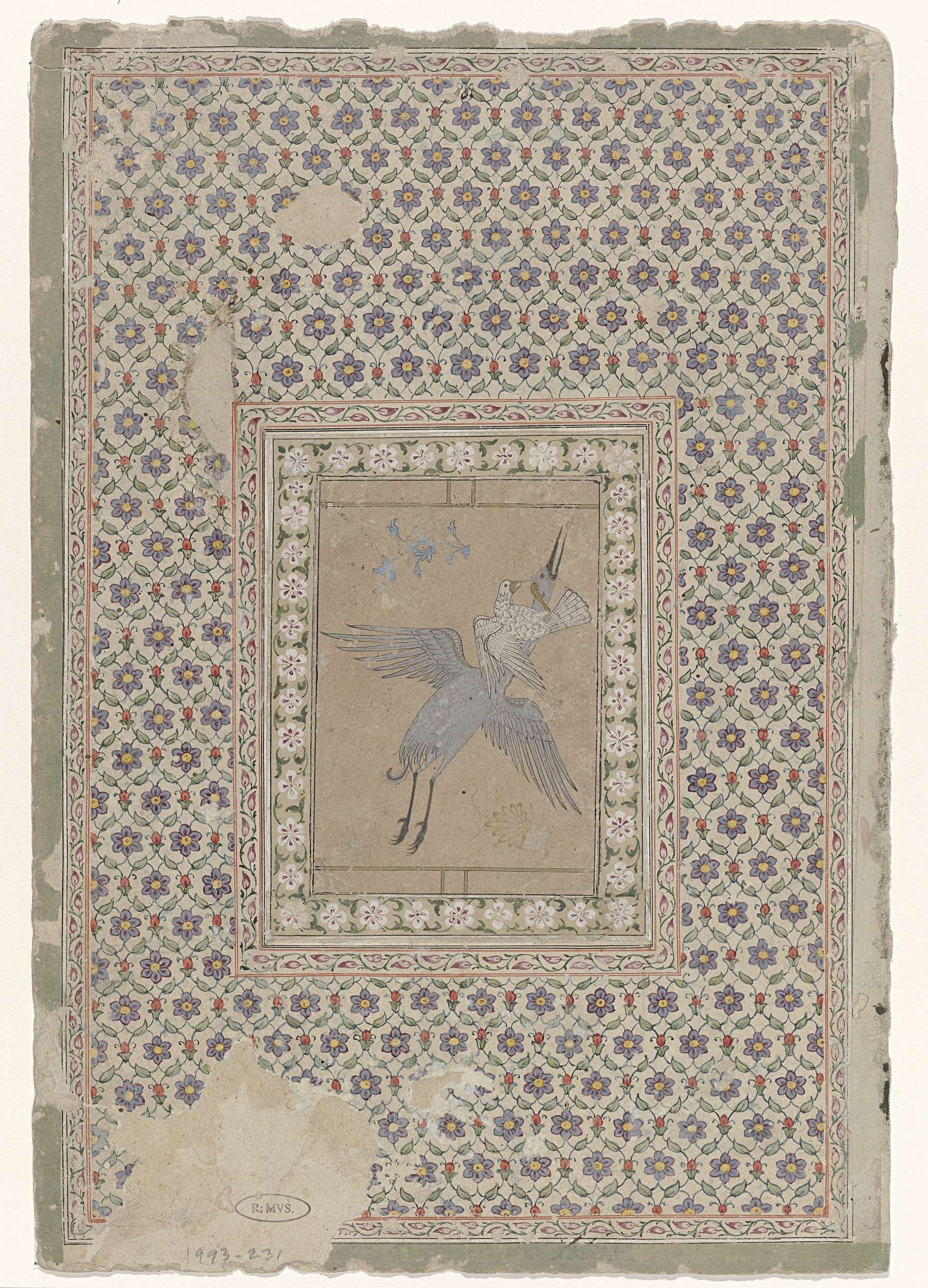 De voorstelling bestaat uit een onversierde rechthoek met daarin een kraanvogel in gestrekte vorm die door een havik wordt gepikt; in rechterbovenhoek een bloesemtak in blauw en links onder een geopende bloem in grijze contouren; rondom de voorstelling kaderlijntjes in een decoratief motief en diverse sierranden met bloemmotieven in heldere kleuren; de brede rand van ...