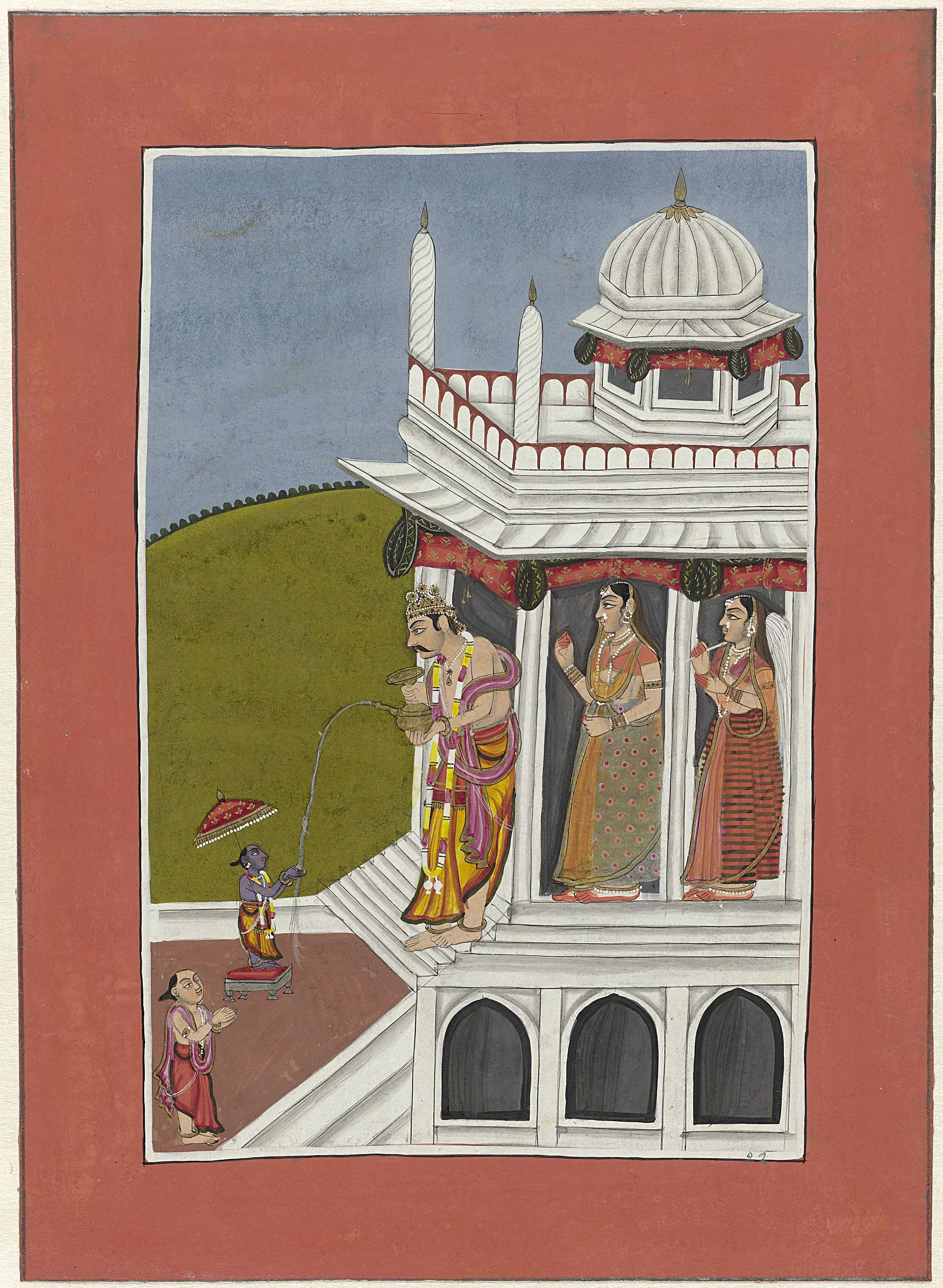 Vishnu als kleine mens verschijnt voor Bali. De voorstelling is omlijst door een smal wit biesje, daaromheen een brede oranjerode sierrand met zwarte kaderlijnen; dit blad is op een blad kardoespapier opgeplakt waarop een zwarte kaderlijn in potlood is getekend.