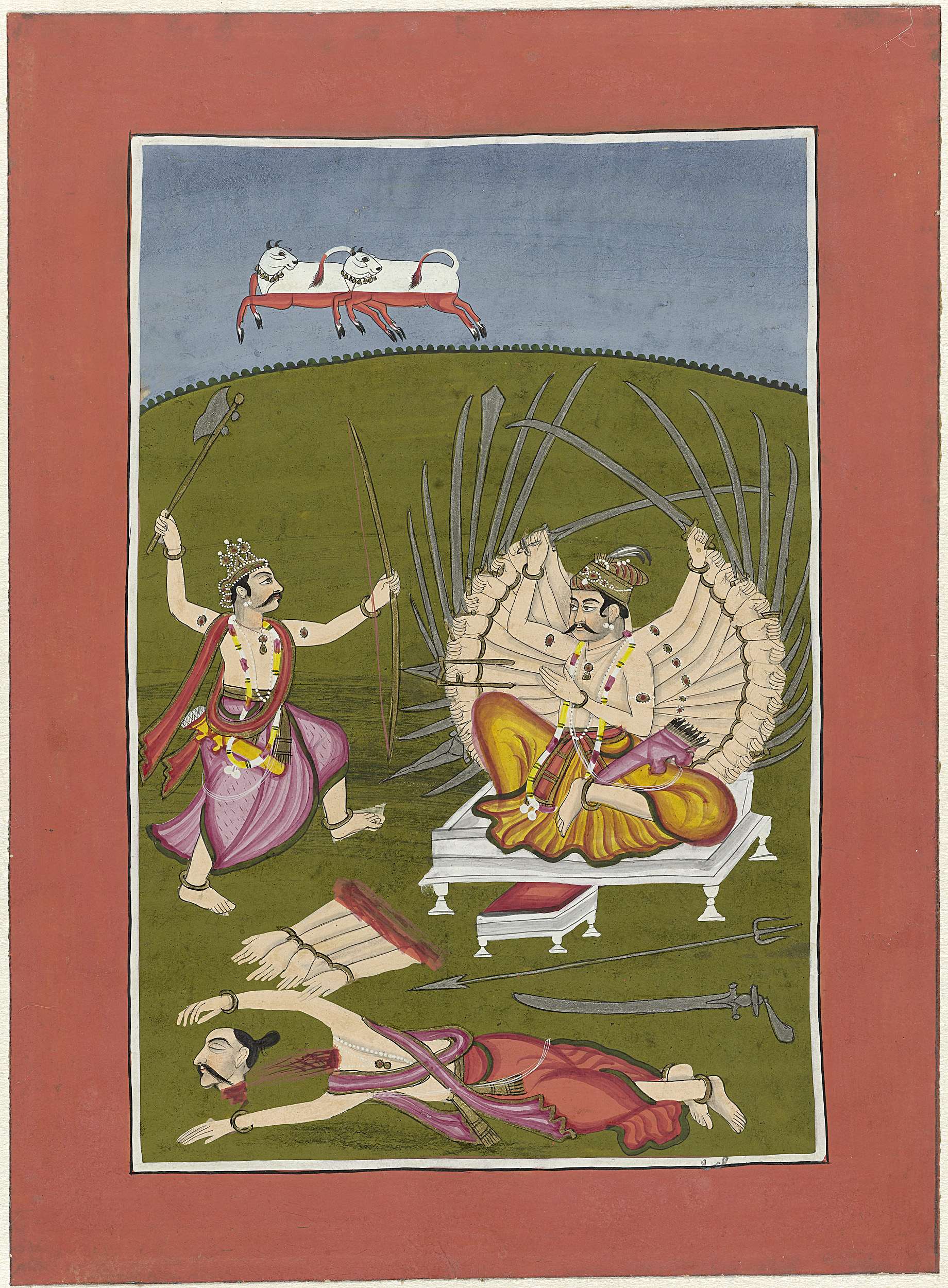 Vishnu als Parasurama trekt met een bijl ten strijde tegen een veelarmige krijgsman. De voorstelling is omlijst door een smal wit biesje, daaromheen een brede oranjerode sierrand met zwarte kaderlijnen; dit blad is op een blad kardoespapier geplakt waarop een zwarte kaderlijn in potlood is getekend.