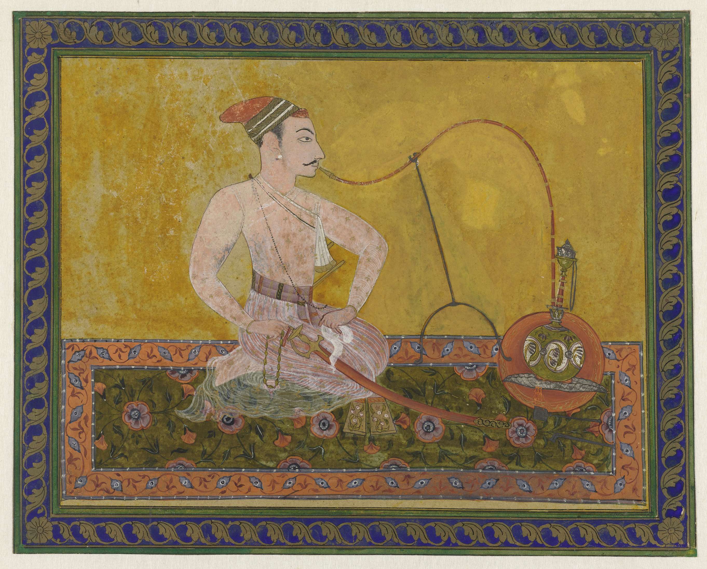 Op een kleurig tapijt zit een waterpijprokende man met profiel naar rechts; in zijn rechterhand houdt hij het handvest van zijn voor hem liggende kromme zwaard vast en ook houdt hij een groene kralenketting in deze hand, zijn linkerarm is gebogen en de hand, waarin een doekje, rust op zijn linkerknie. De voorstelling is omlijst ...