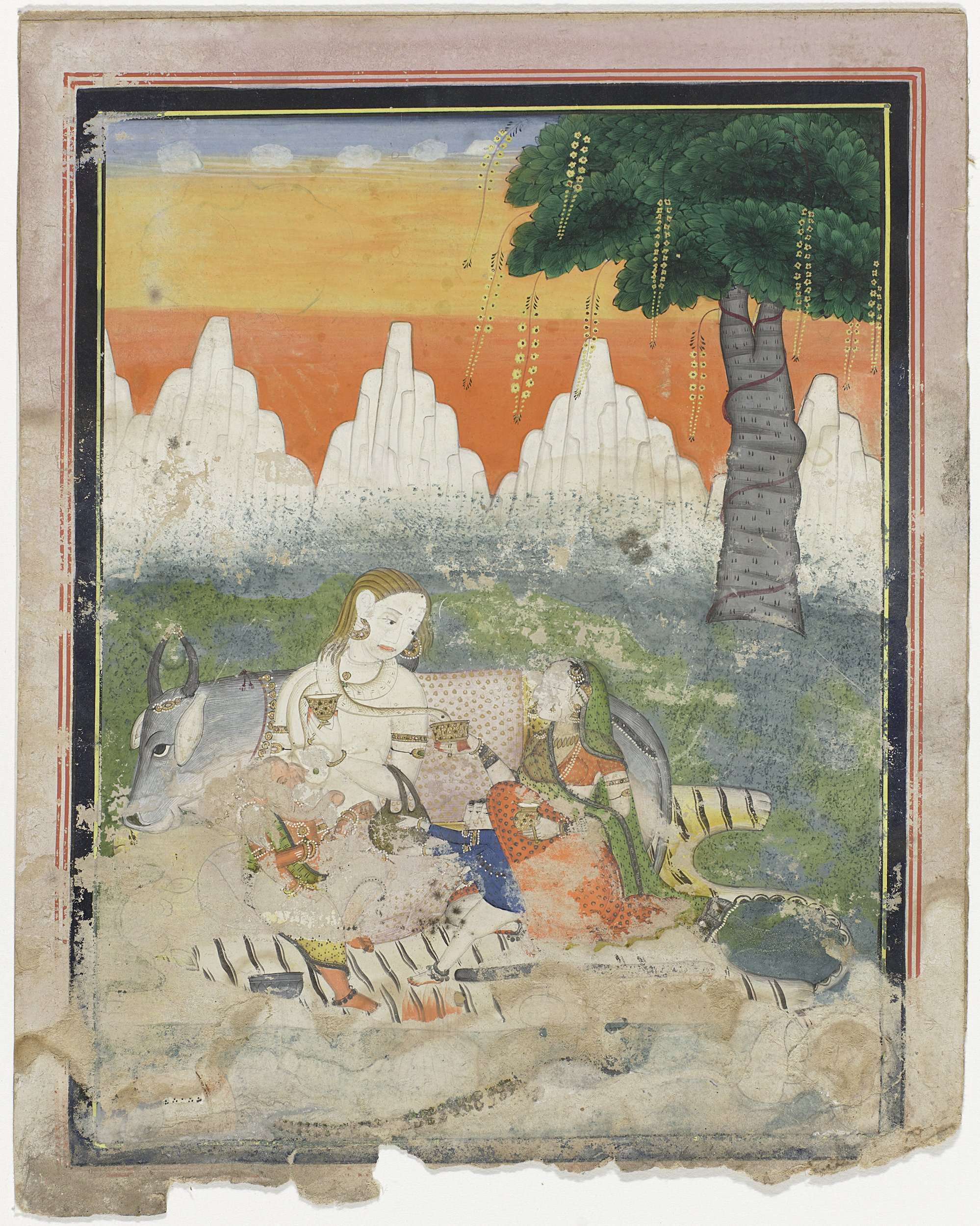 Shiva en Parvati buiten op een grasveld met een koe achter hun rug en een rotsachtig landschap op de achtergrond. De voorstelling wordt omlijst door een smalle rand in zwart met een geel biesje en een roze buitenrand met rode kaderlijnen: zowel de voorstelling als het blad zijn zwaar beschadigd op de onderste helft.