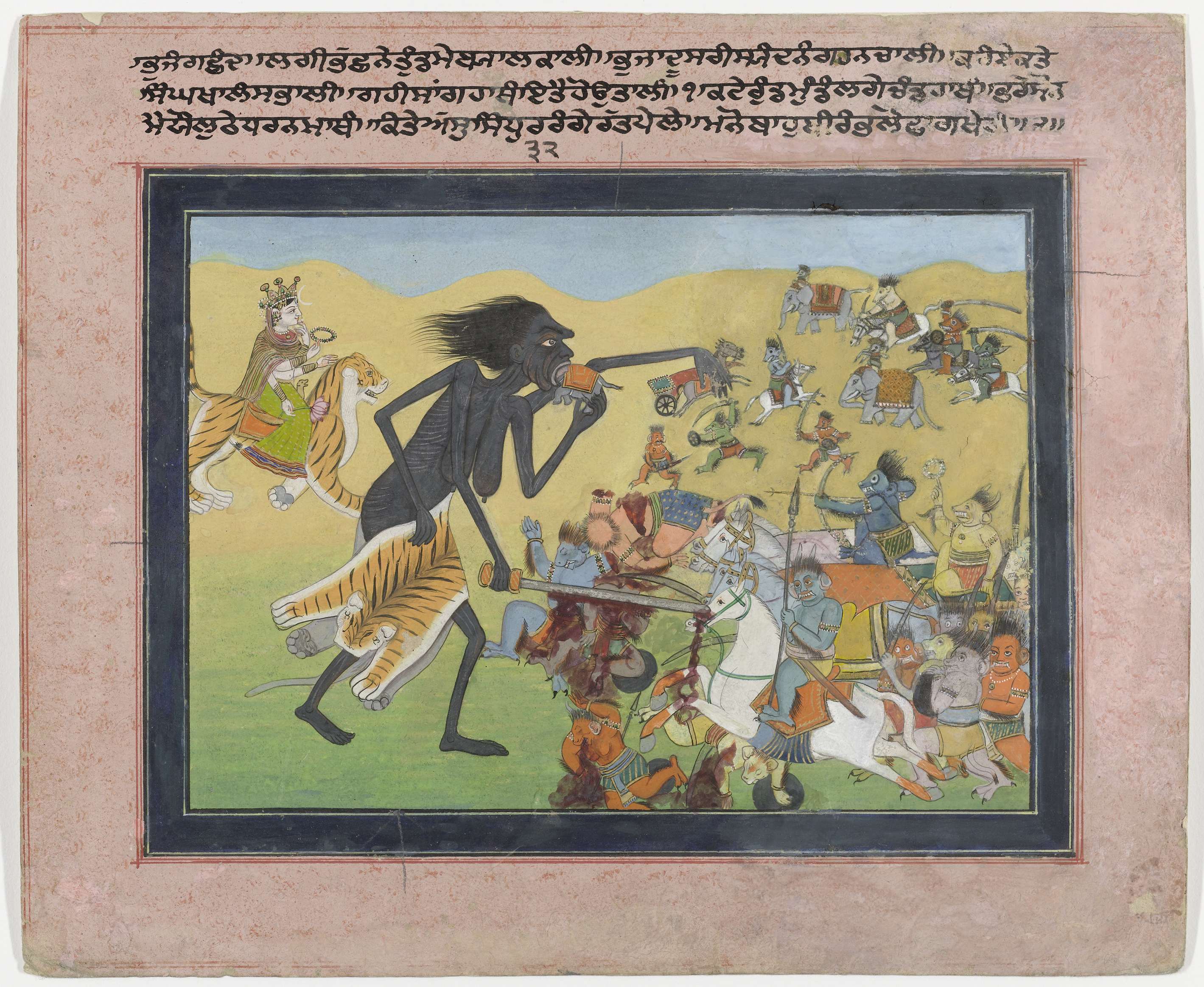 Kali is de angstaanjagende verschijningsvorm van de Grote Godin. Zij is hier uitgebeeld als een uitgemergelde oude vrouw met hangende borsten en rafelig haar; zo is ze de personificatie van de woede van de Grote Godin en bestrijdt ze de demonen. De Grote Godin zelf is linksboven te zien, rijdend op haar tijger. Machtige, gevaarlijke ...