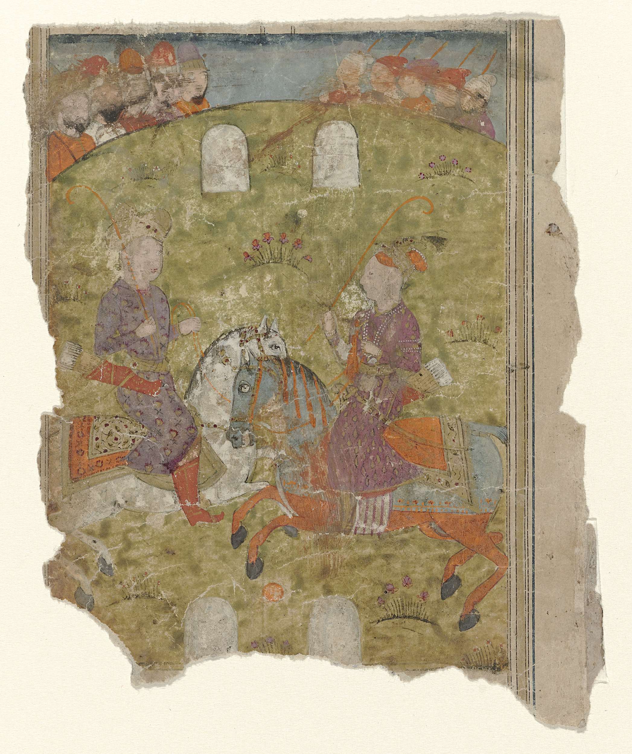 Twee ruiters tegenover elkaar houden elk een rode zweep vast, op de achtergrond achter de heuvels krijgers(?). Restant van een blad, onderste helft verdwenen, linkerhelft beschadigd en deels verdwenen. Op verso twee kolommen tekst in oud-Perzisch schrift.