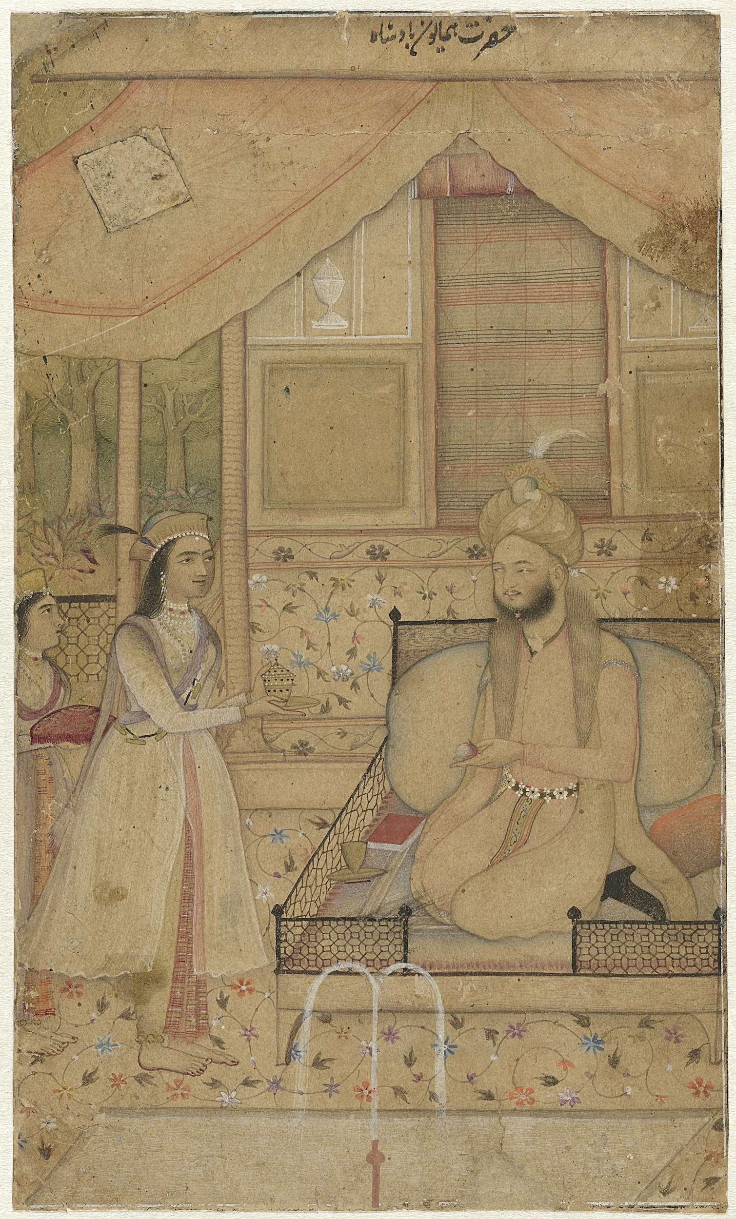 Een vorst zittend op een bed laat zich bedienen door een vrouw die links staat, achter haar een tweede vrouwenfiguur met een kussentje in haar handen.