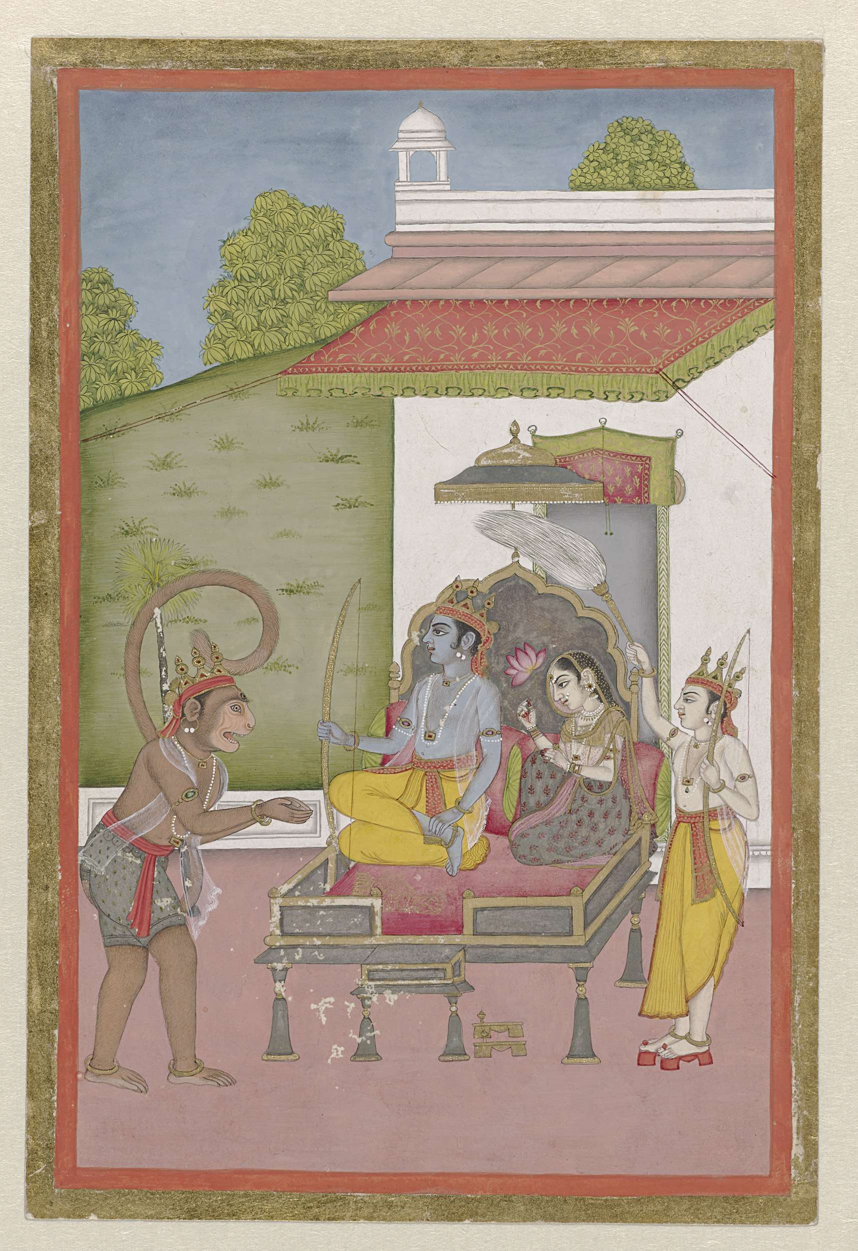 Het populaire oude epos, Ramayana, dient als voorbeeld van deugdzaam gedrag en spirituele idealen. Het verhaal gaat over verbanning en afscheiding. De hoofdpersoon Rama is een goddelijke prins en staat bekend als een van de verschijningsvormen van de hindoegod Vishnu. In deze scène zit het ideale echtpaar Rama en Sita op een troon en ontvangen ...